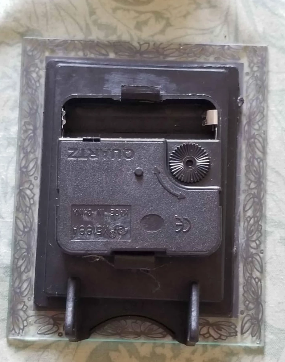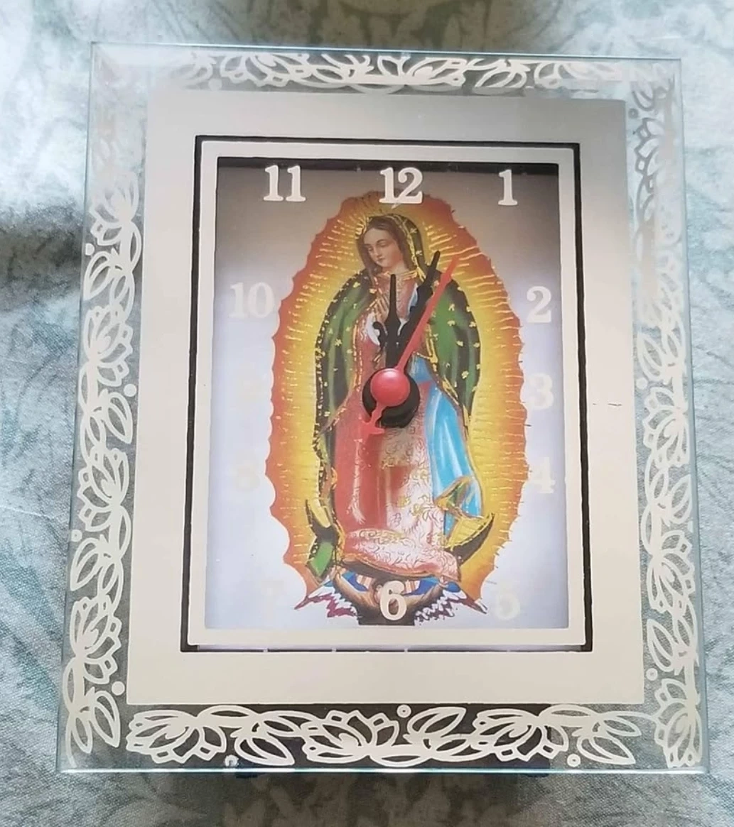 Small glass framed clock. Features image of Virgin Mary. Battery operated. Good condition.