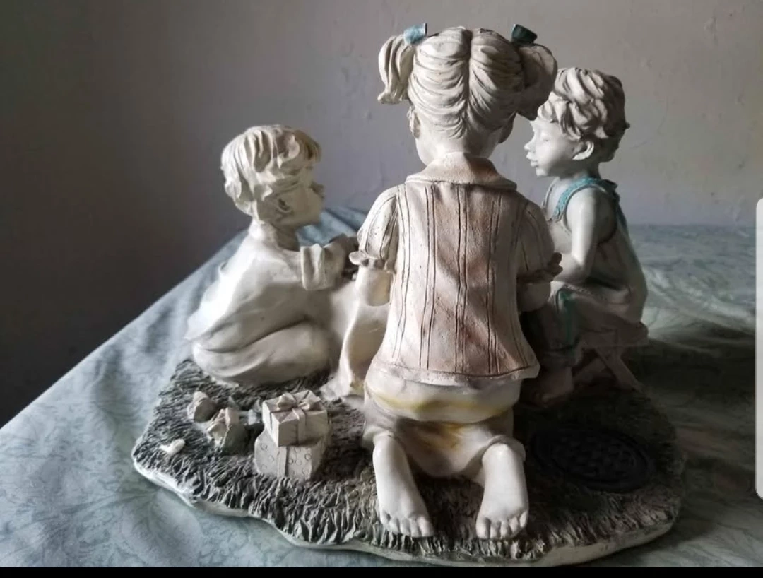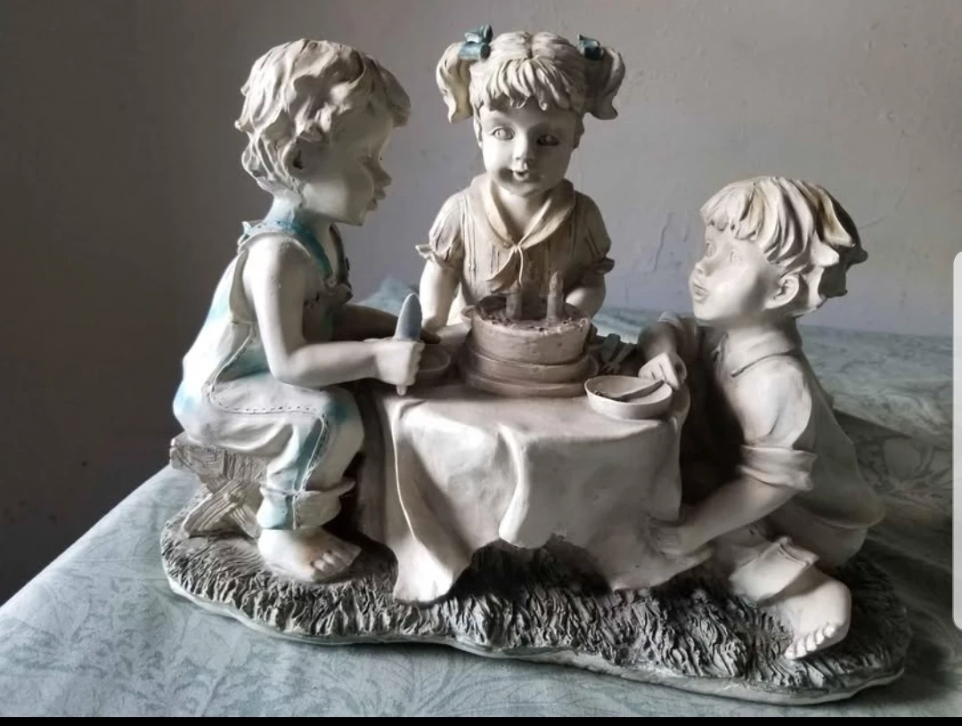 Charming figurine of three children celebrating a birthday. Lovely detail. Perfect for a child's room or collector.