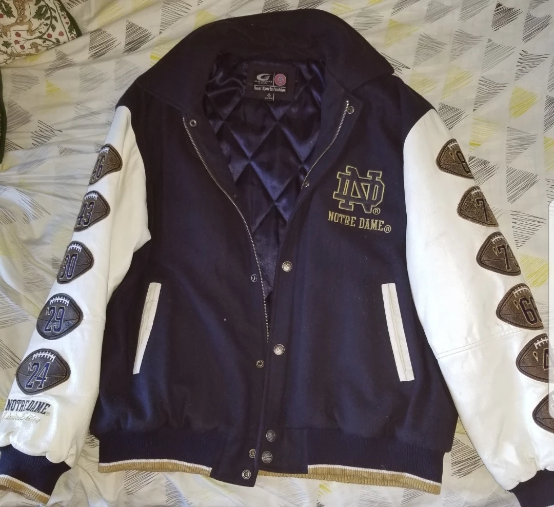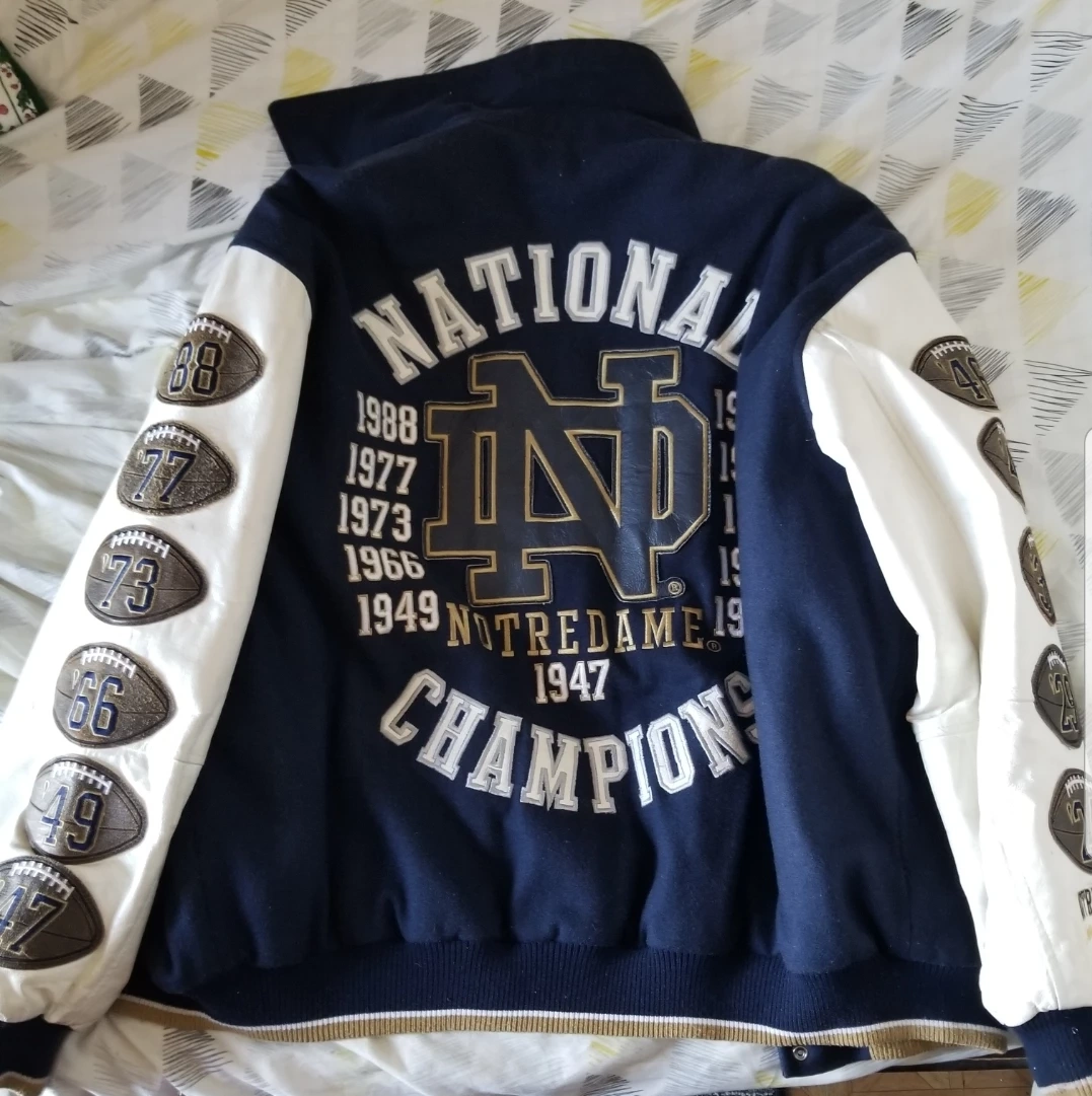 Men's Notre Dame Fighting Irish varsity jacket. Features leather sleeves, embroidered Notre Dame logo, and years of national championships. Great condition.