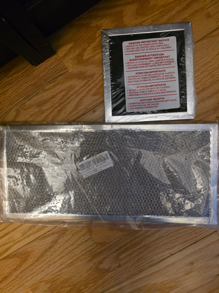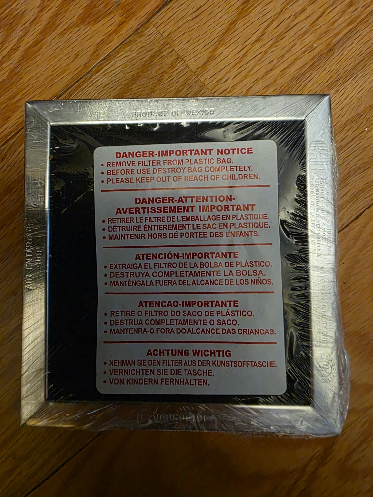 New in package. Charcoal filter for range hood. Metal frame. Includes instruction sheet.