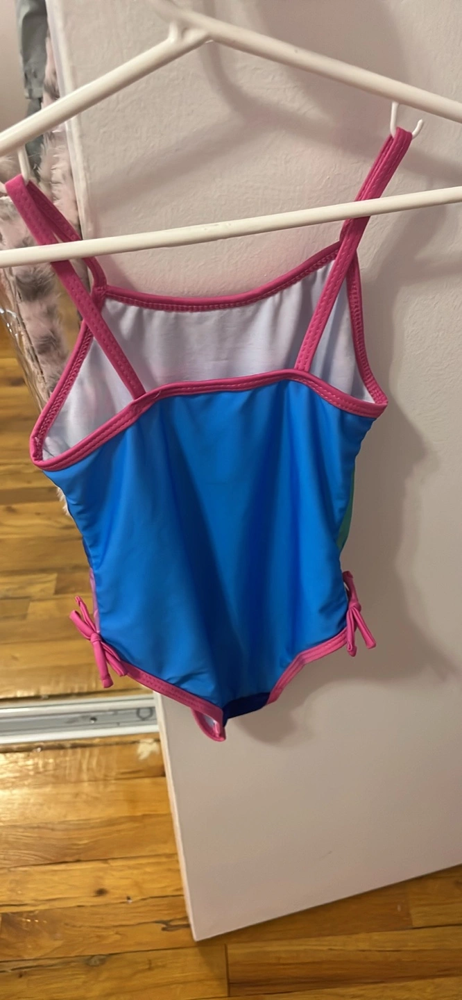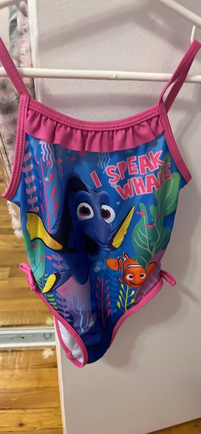 15Adorable Finding Dory swimsuit. Features Dory and Nemo. Pink straps and accents. Size 4. Drawstrings on sides.