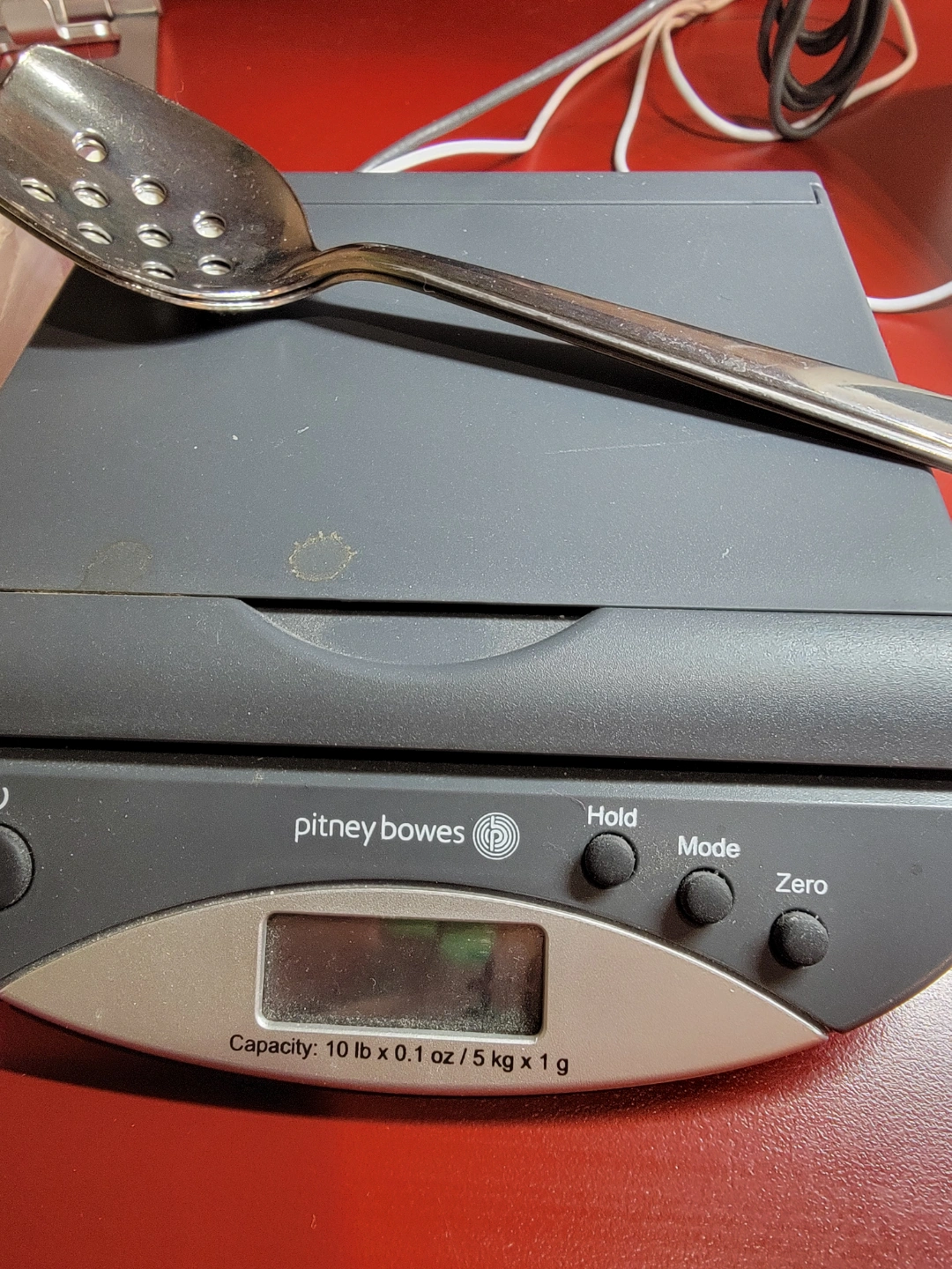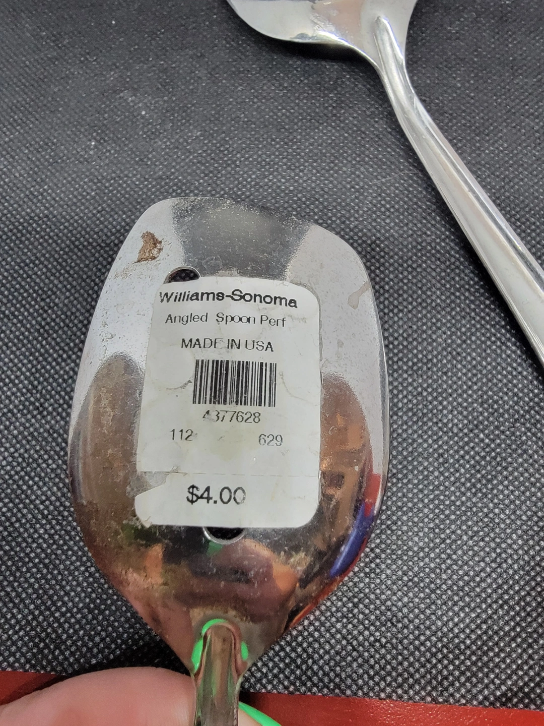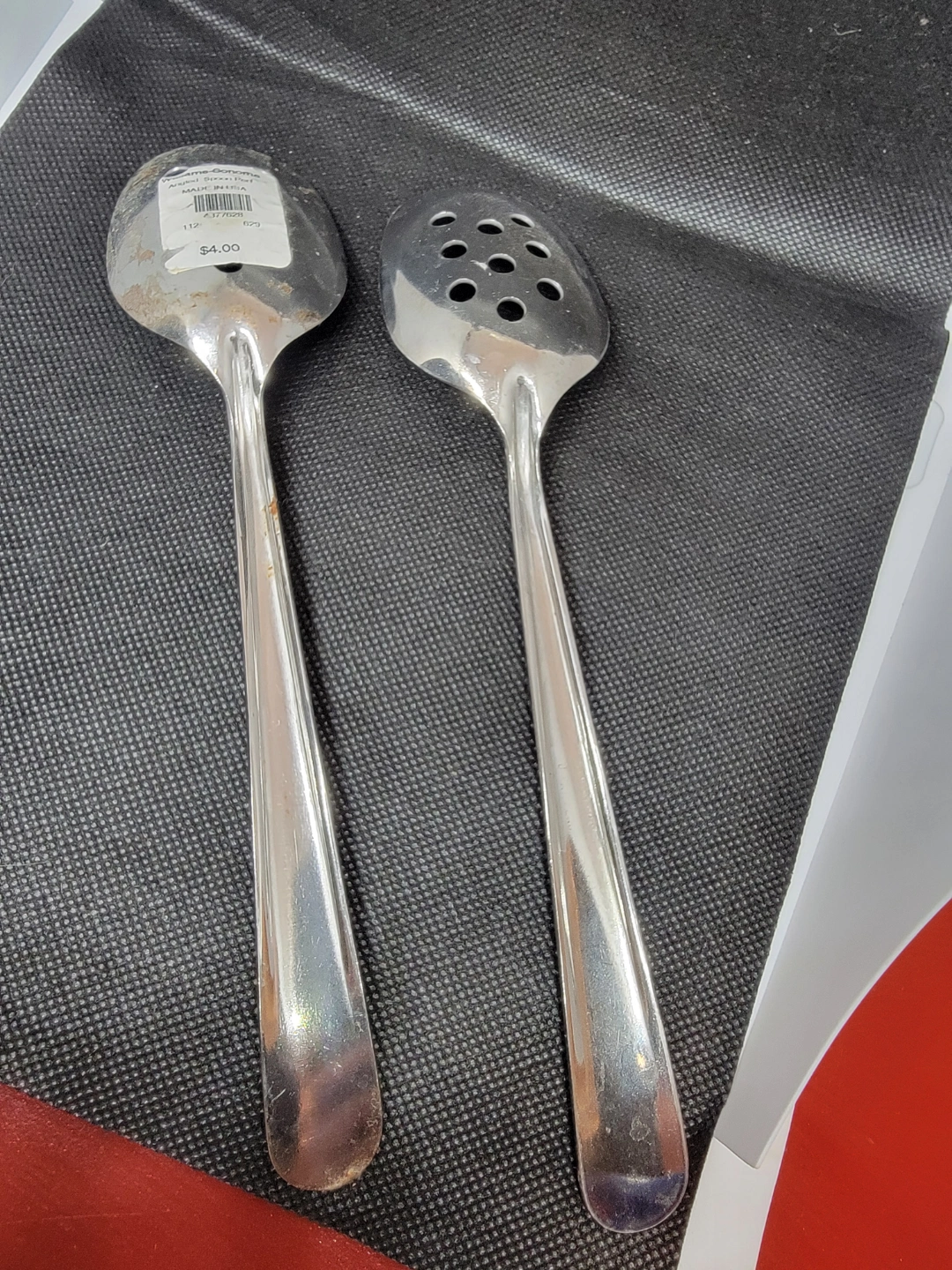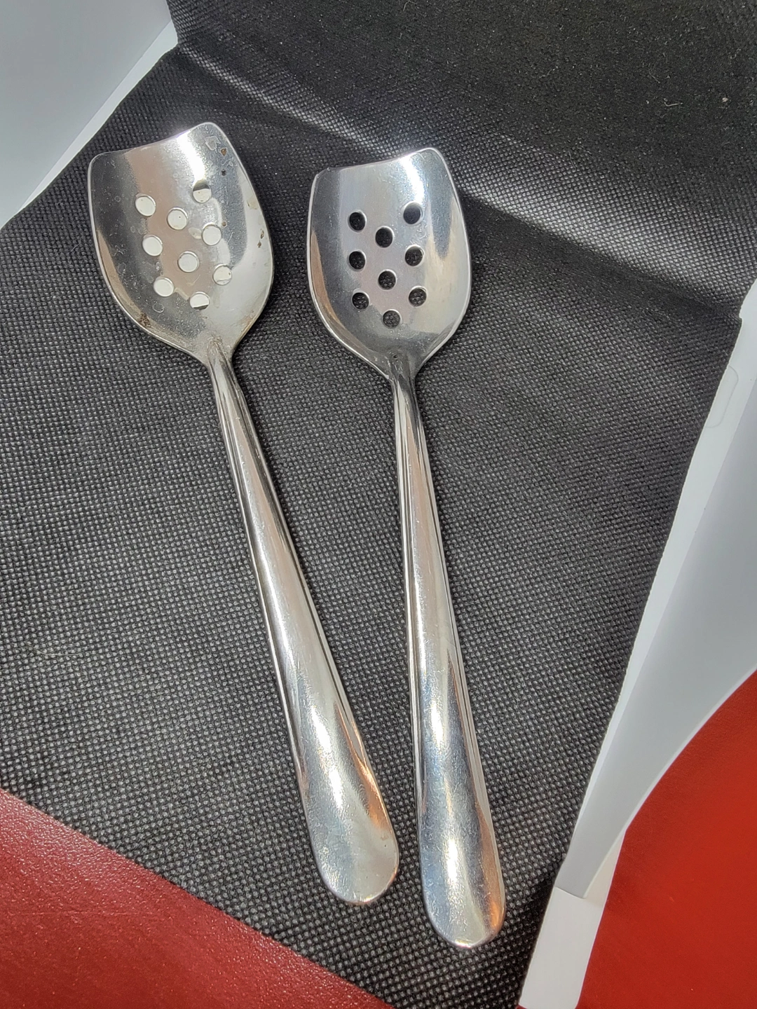 Pair of stainless steel perforated spoons. Angled design. Made in the USA. Great for serving or draining.