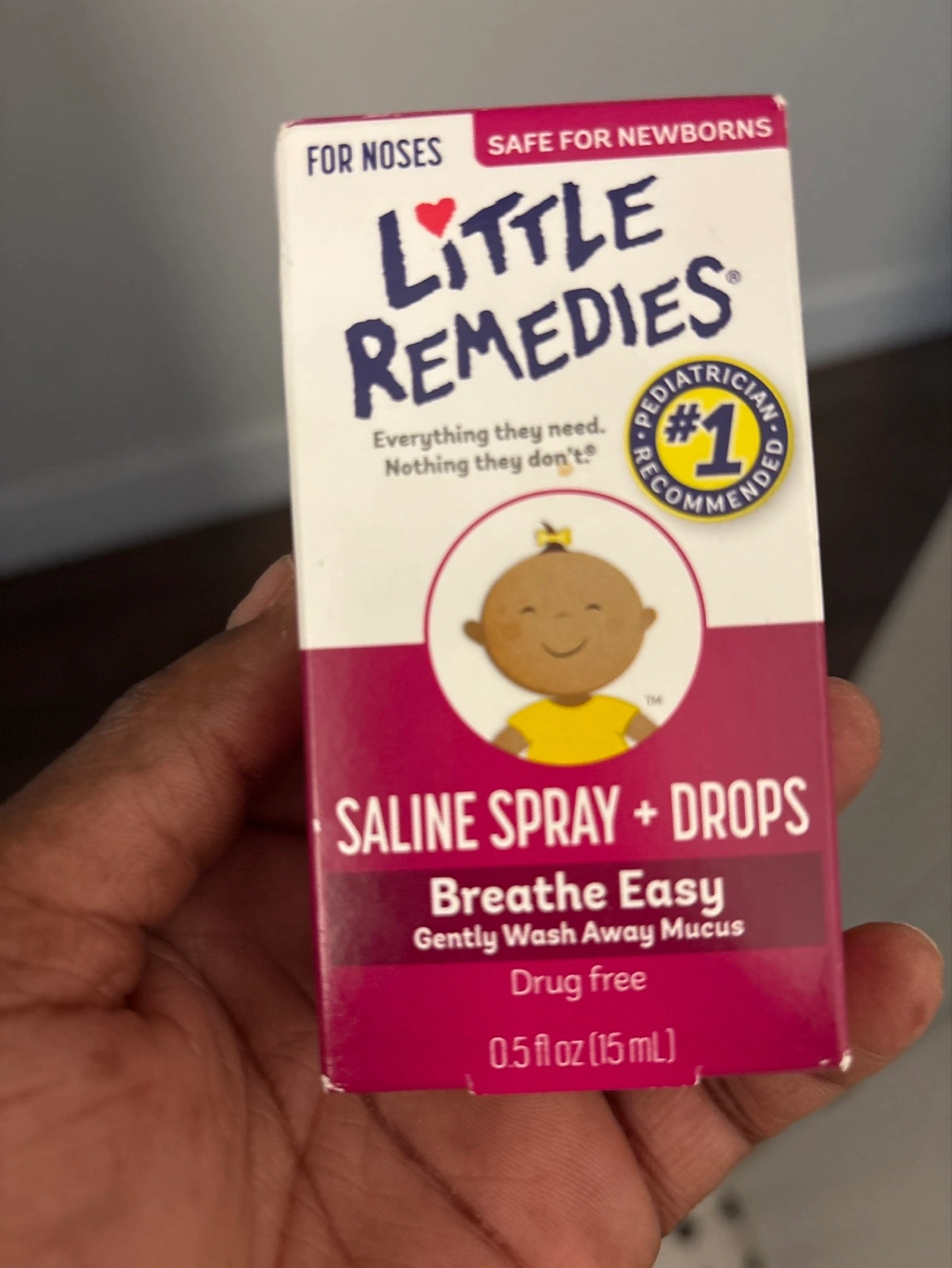 Drug-free saline spray and drops. Gently washes away mucus. Safe for newborns. 0.5 fl oz (15 mL). For noses.