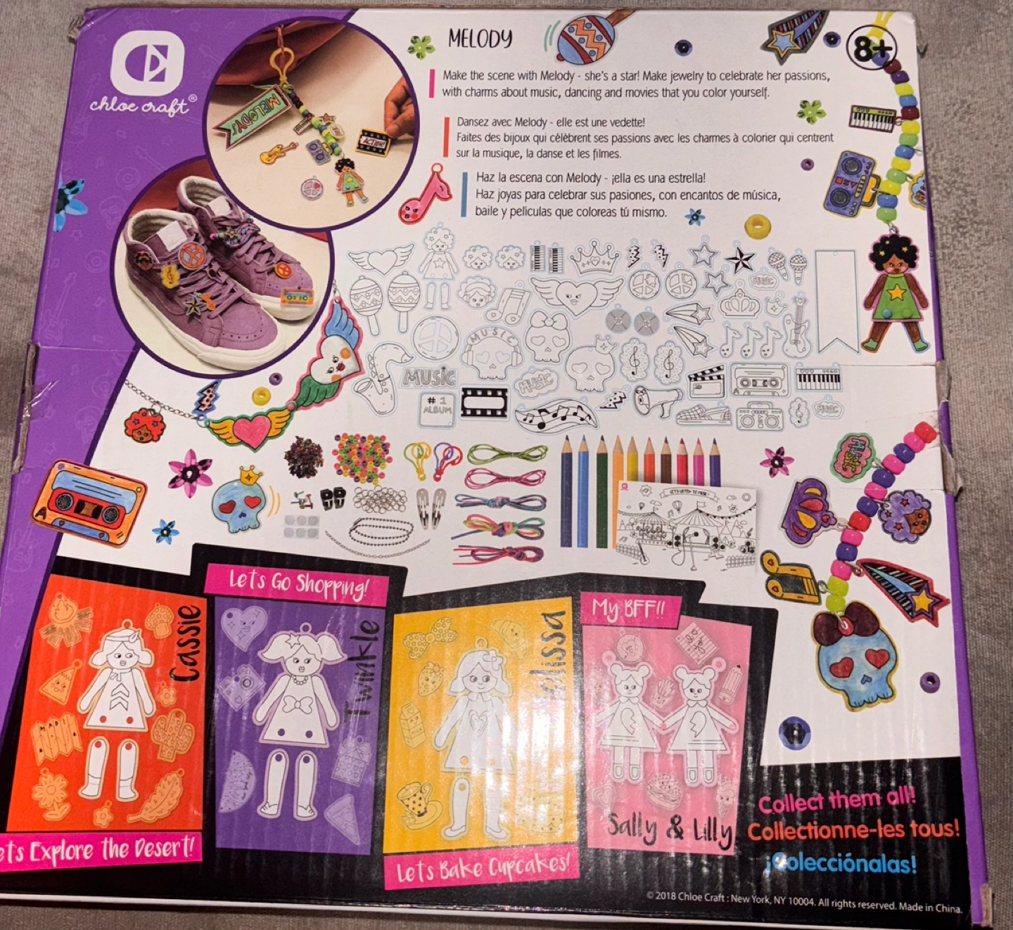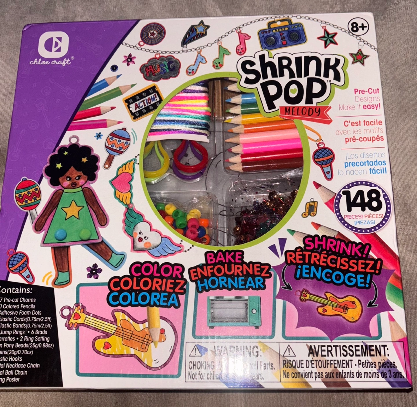1000+New Chloe Craft Shrink Pop Melody craft kit. Includes pre-cut charms, colored pencils, elastic cords, beads, and more. Bake and decorate to create unique jewelry. 148 pieces total. For ages 8+