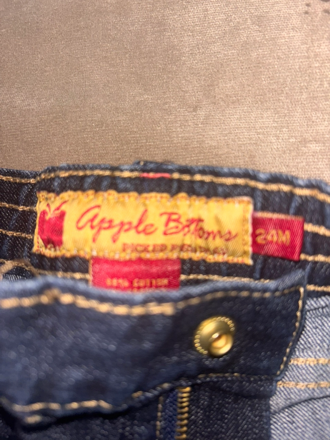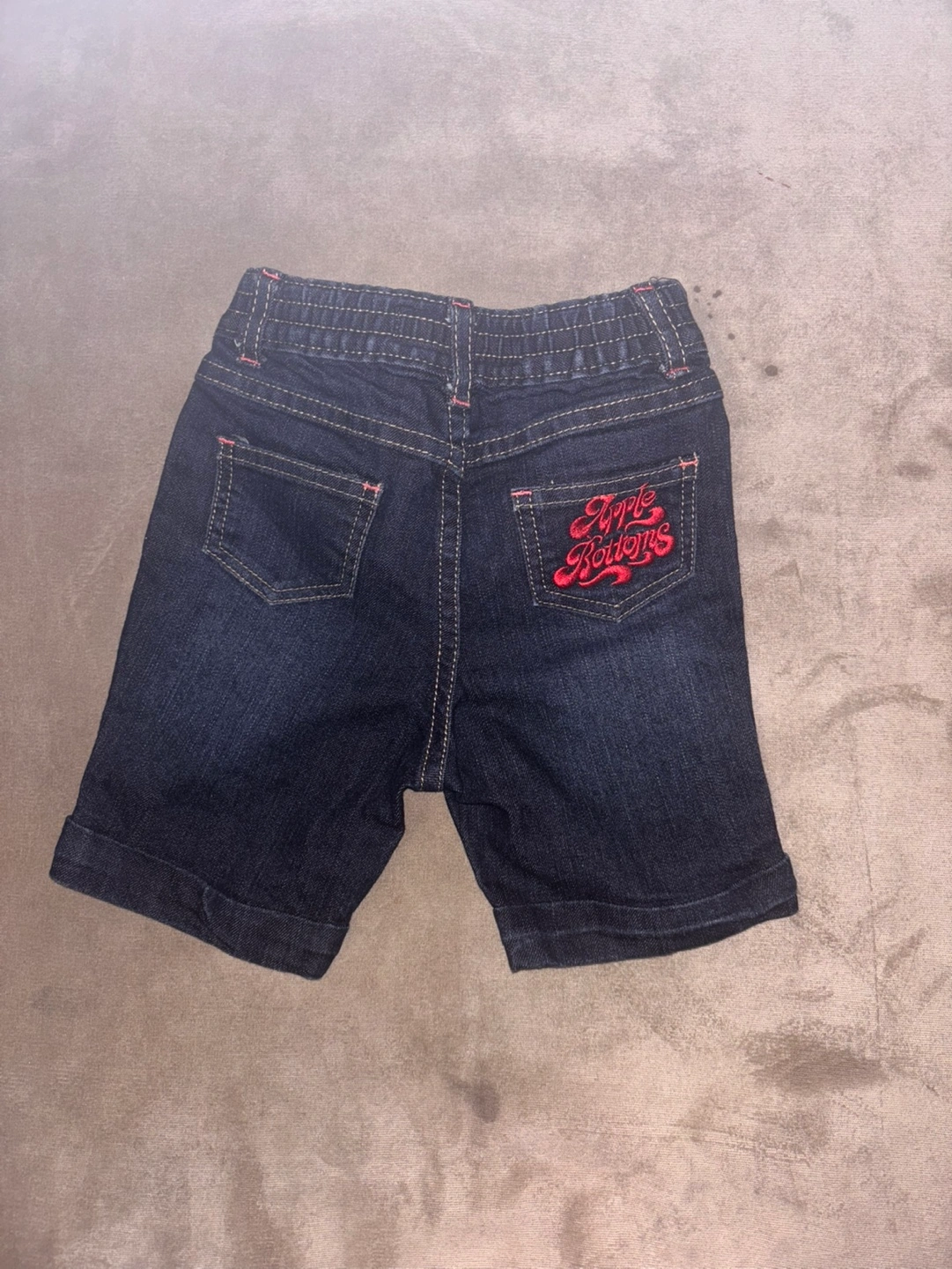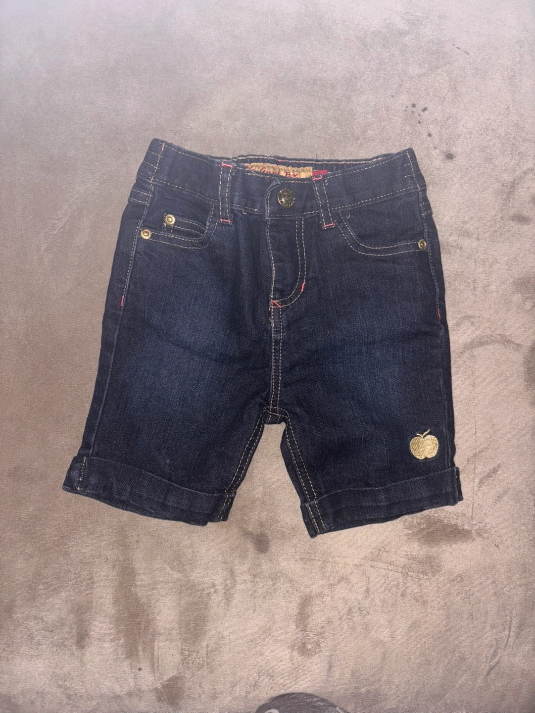 1000+Dark wash denim shorts. Rolled cuffs. Embroidered logo. Gold button accents. Size 24 Months.