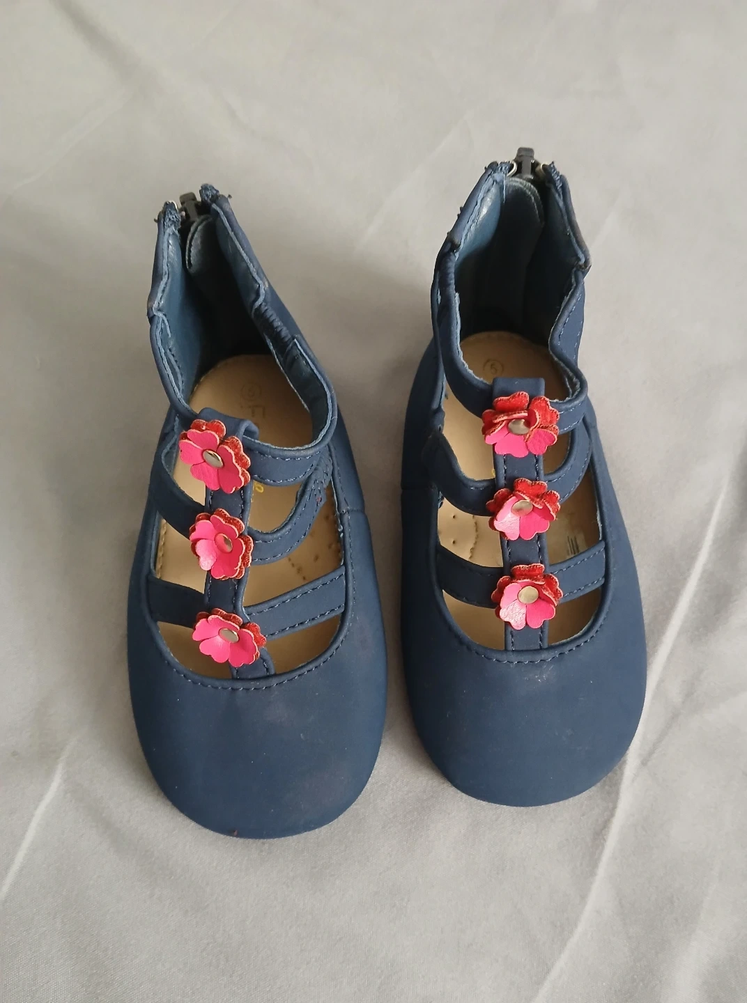1000+Adorable baby girl shoes. Navy blue, pink flower accents. Size 5. Zipper closure. Great for special occasions.