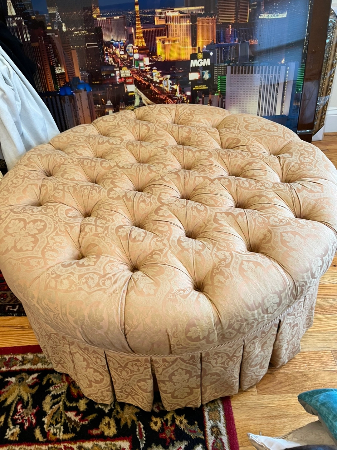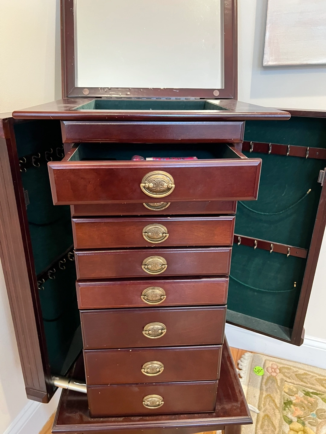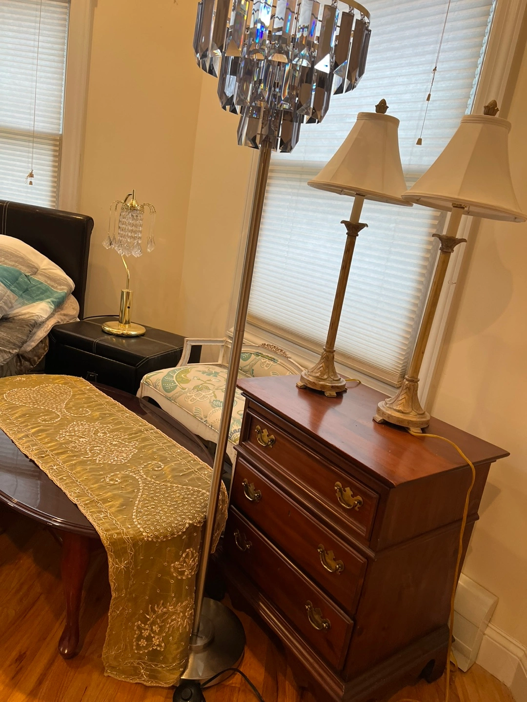 Beige round ottoman, pleated skirt. Two floor lamps, crystal accents. Dark wood end table, three drawers. Dark wood jewelry armoire, mirrored top, multiple drawers and hooks.