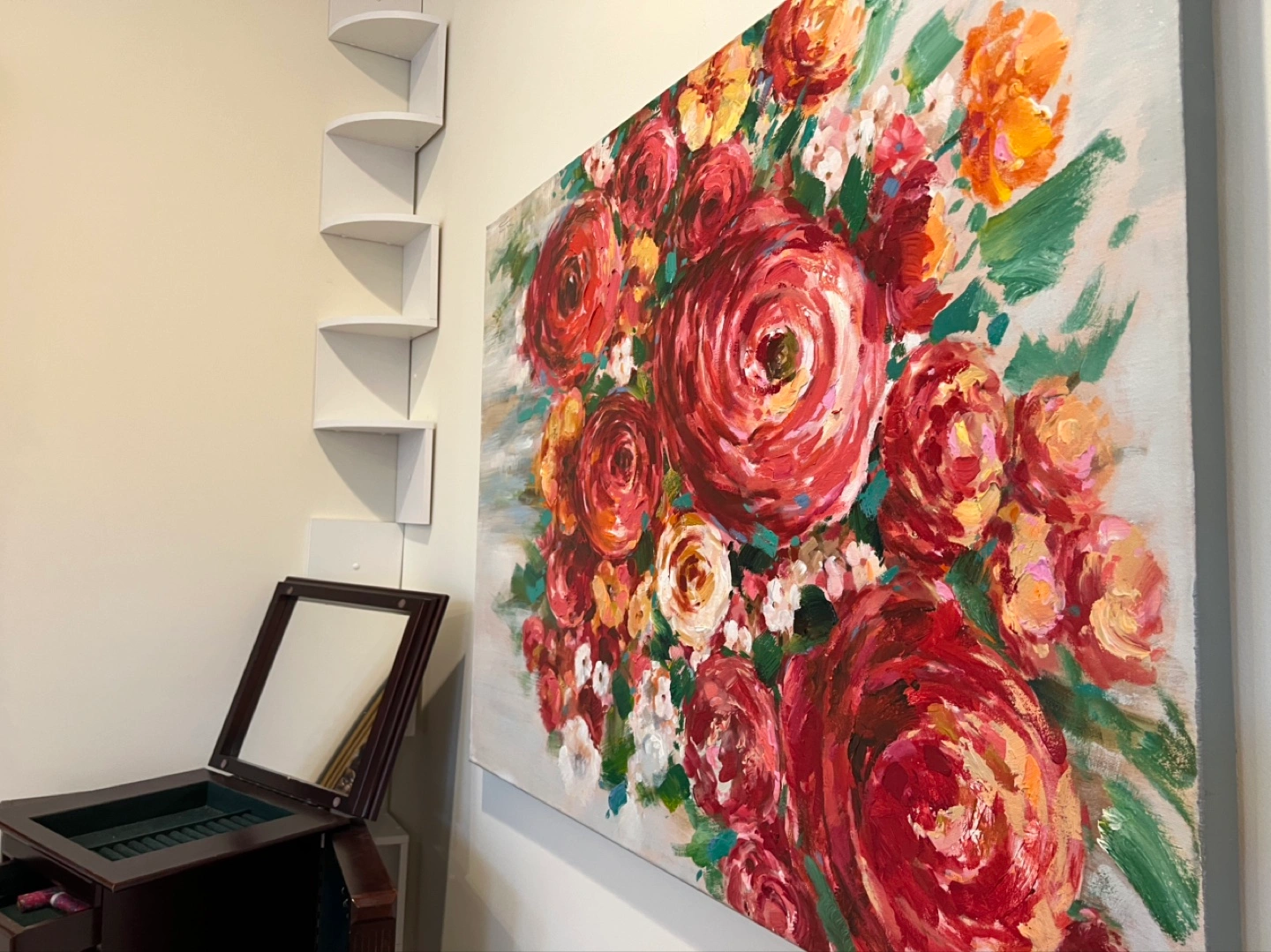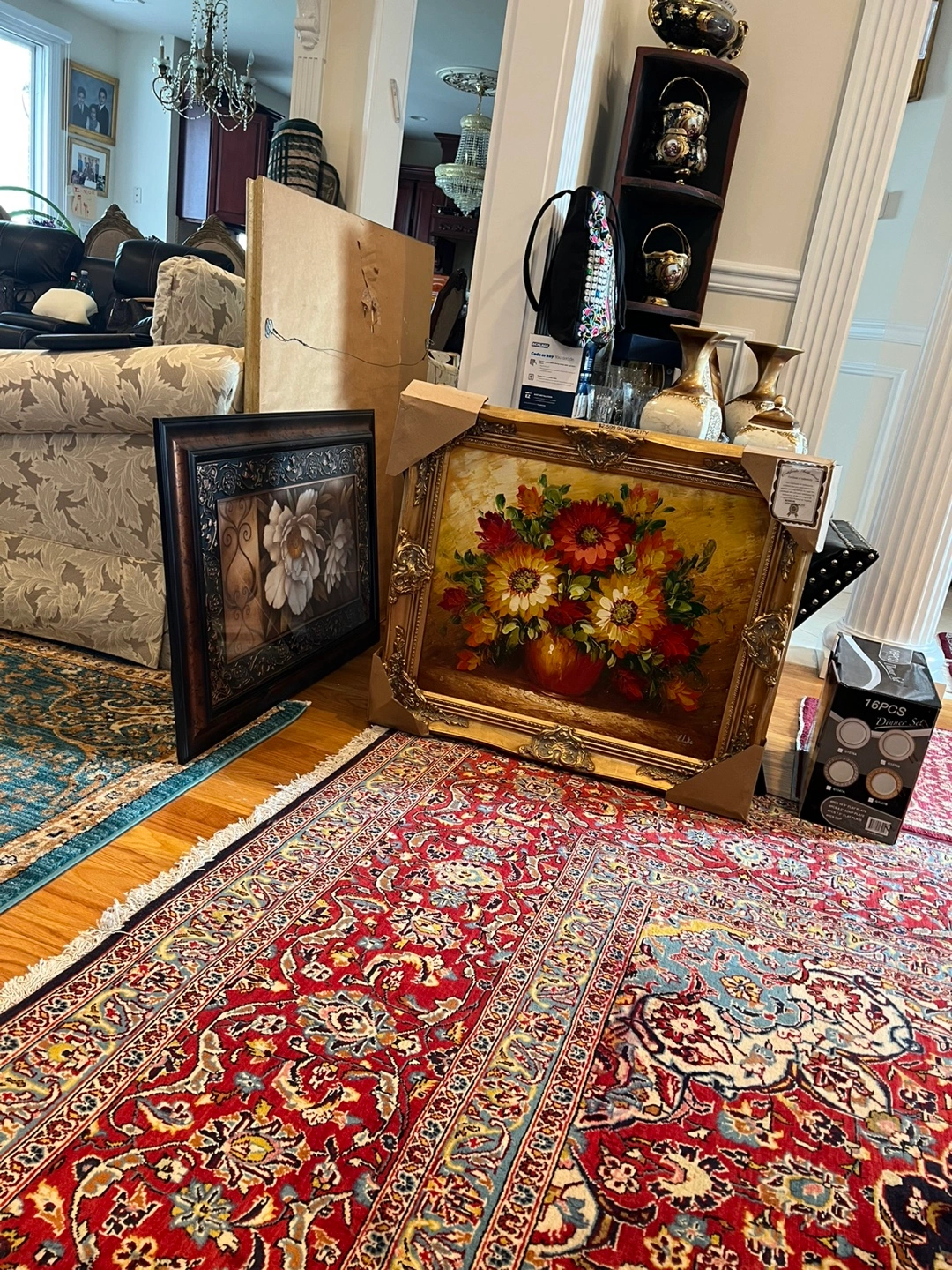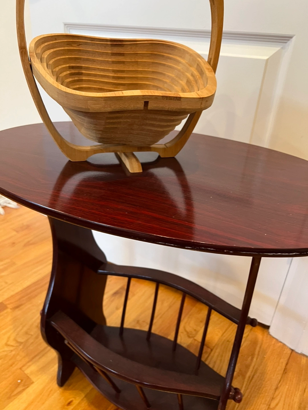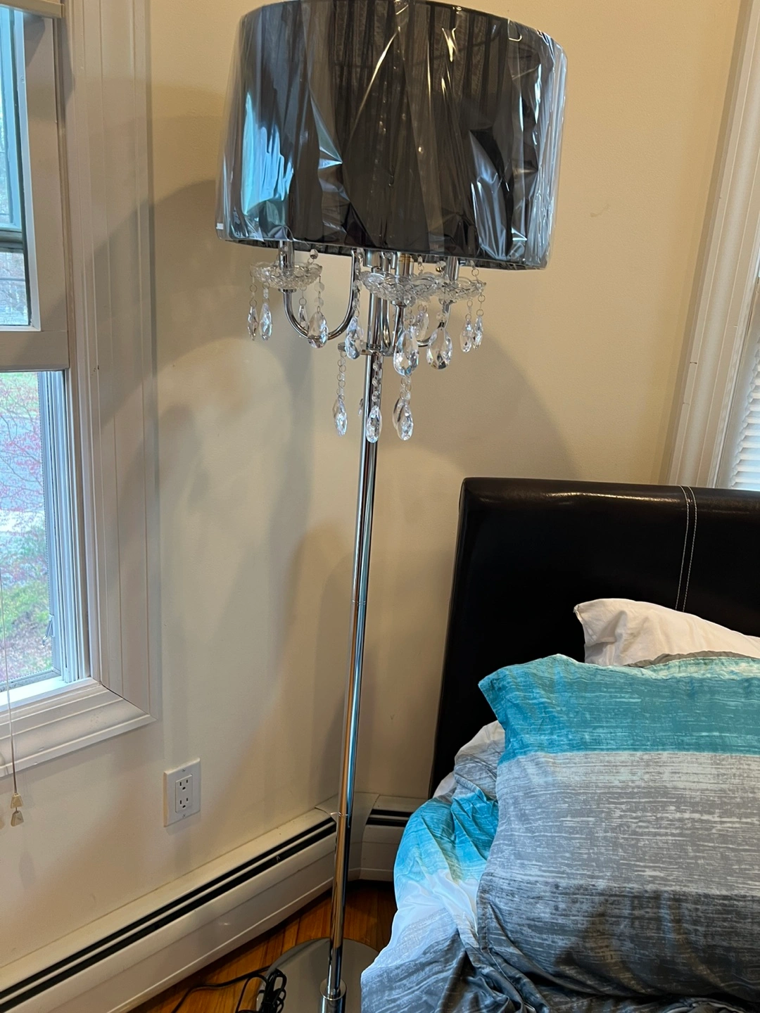 Beige round ottoman, pleated skirt. Two floor lamps, crystal accents. Dark wood end table, three drawers. Dark wood jewelry armoire, mirrored top, multiple drawers and hooks.