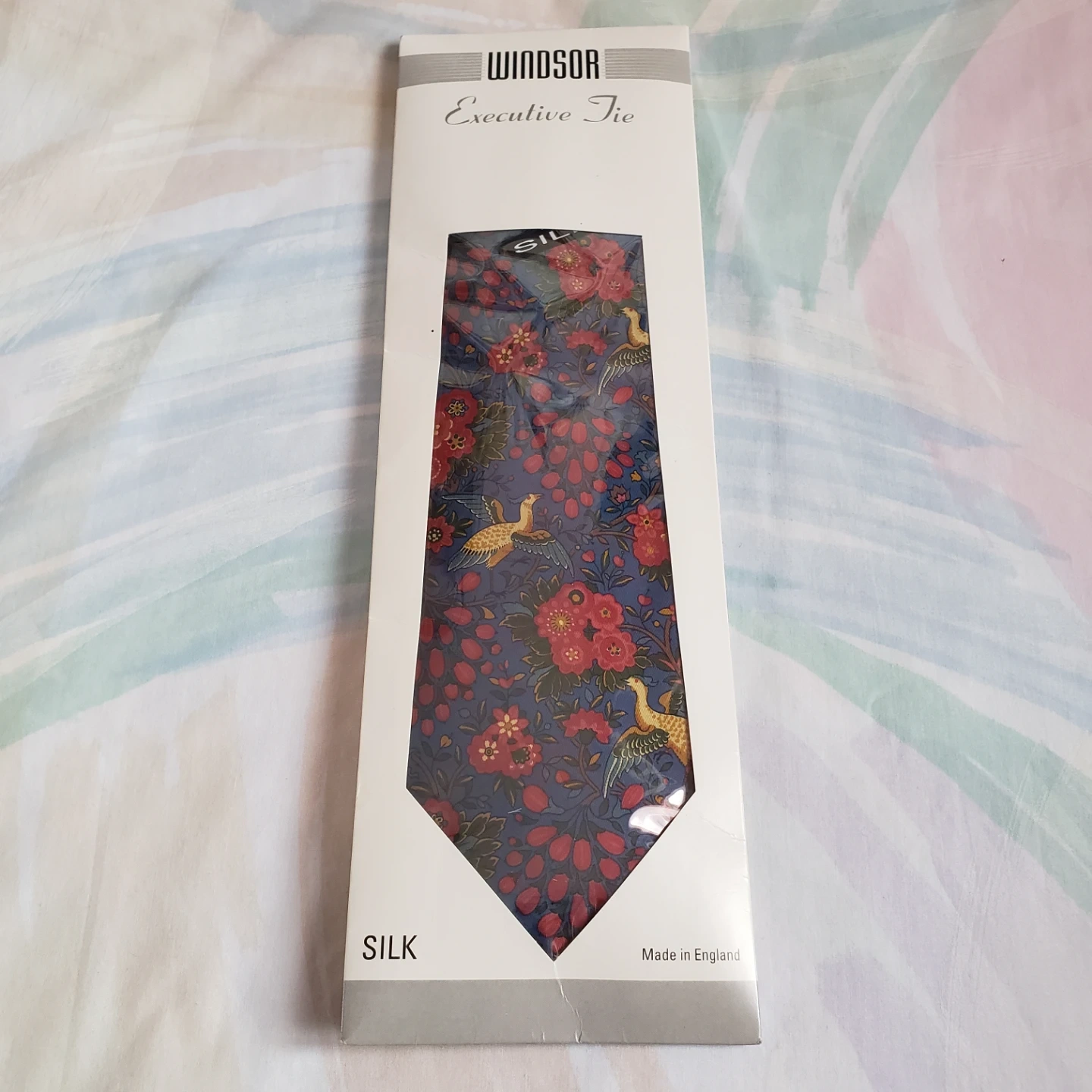 1000+Executive silk tie made in England Design features flowers and birds Brand new, in its original packaging I'm downsizing and hoping the item finds a new home! From a smoke-free & pet-free home All exchanges are final; no negotiations Pick-up only Location: Yonge/Elgin Mills Serious inquries only; messaging only through Karrot Thank you for your interest & please check my other listings for more!