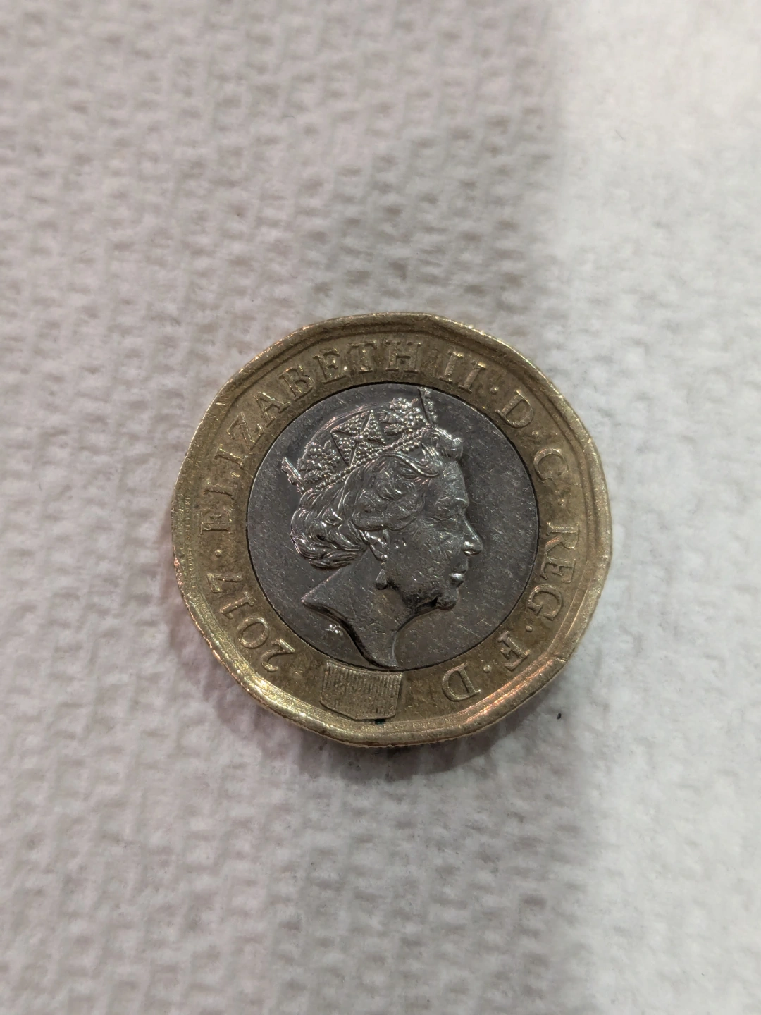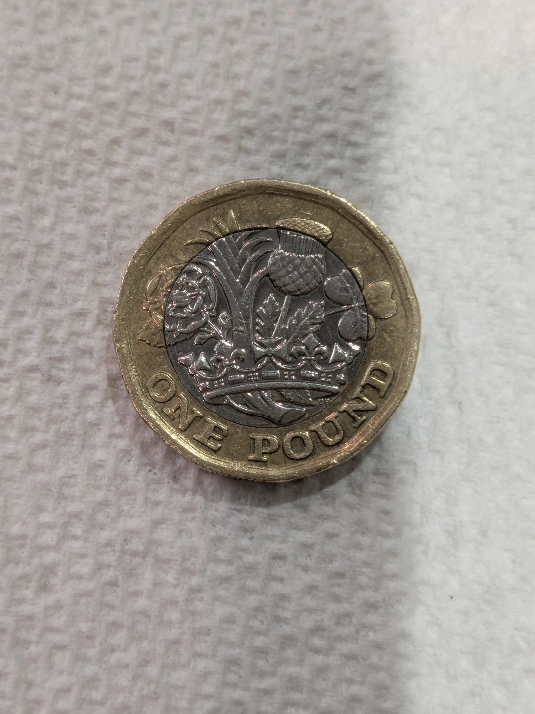 British one pound coin. Queen Elizabeth II Nations of the Crown on obverse. Floral emblem on reverse. Collector's item or currency first coin 2017 BI -Metalic