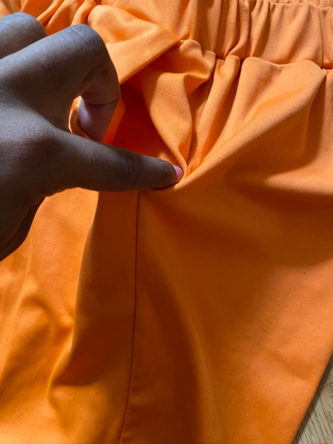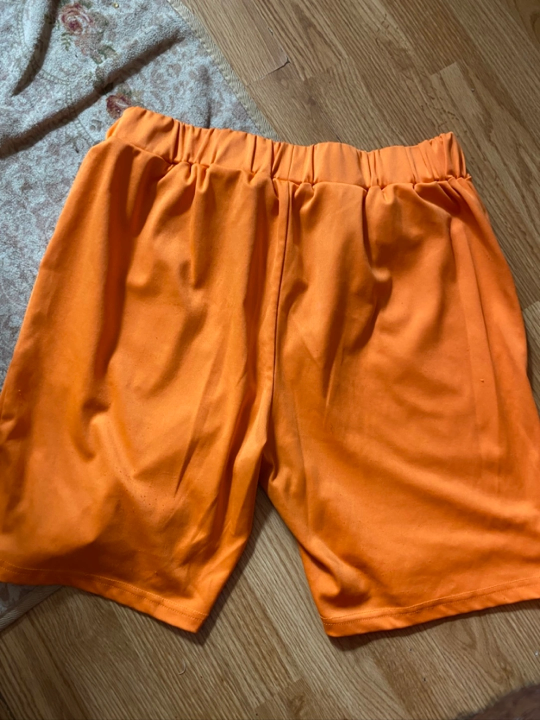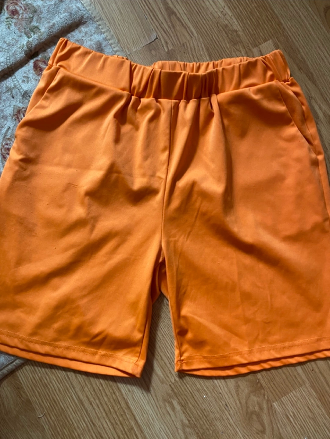 142Men’s orange bike shorts. Elastic waistband. Side pockets. Great for working out or casual wear.