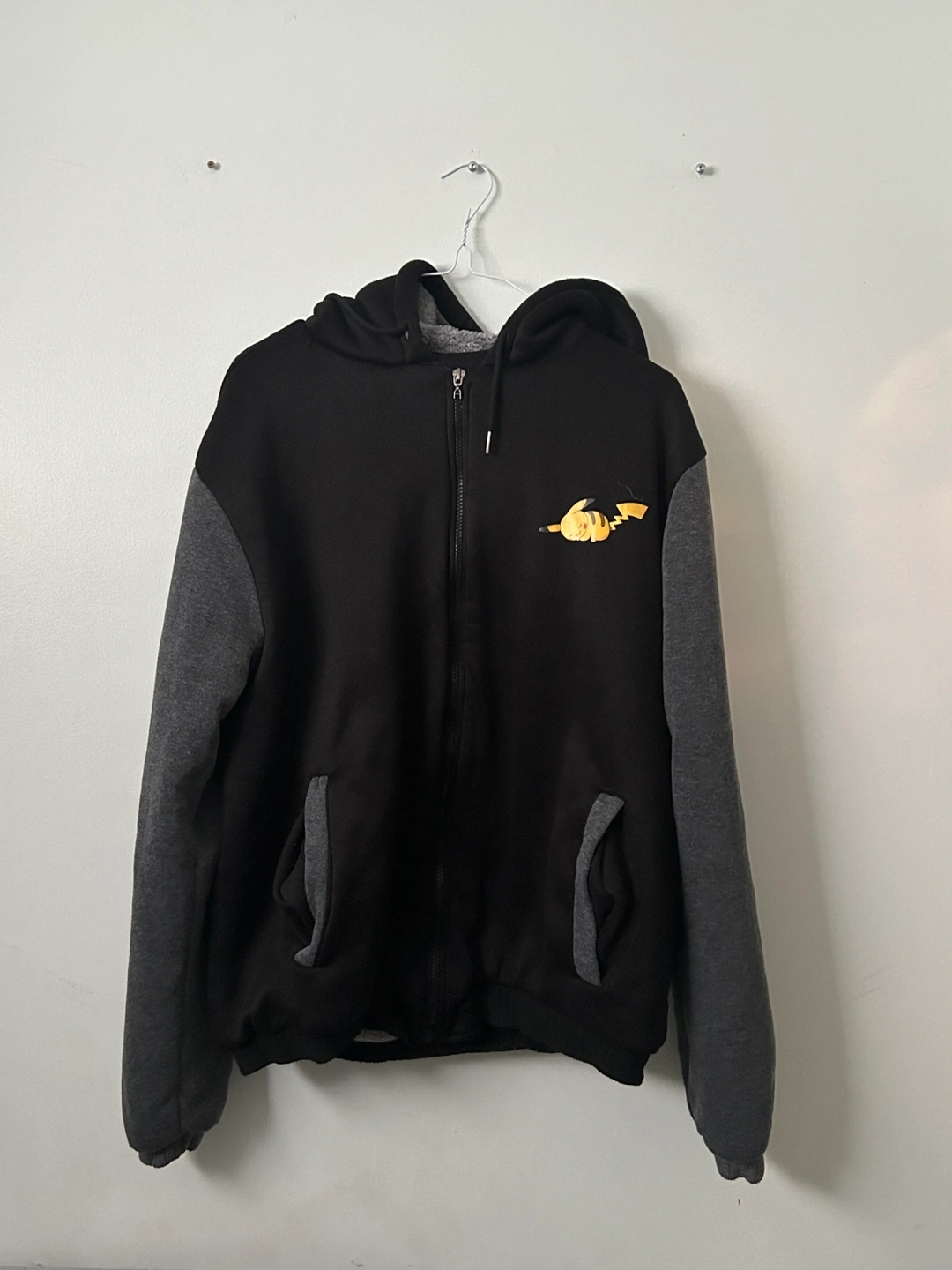 Black and grey zip-up hoodie. Features a parody of the Nike "Just Do It" logo with a sleeping Snorlax. Great for fans of Pokémon and Nike.