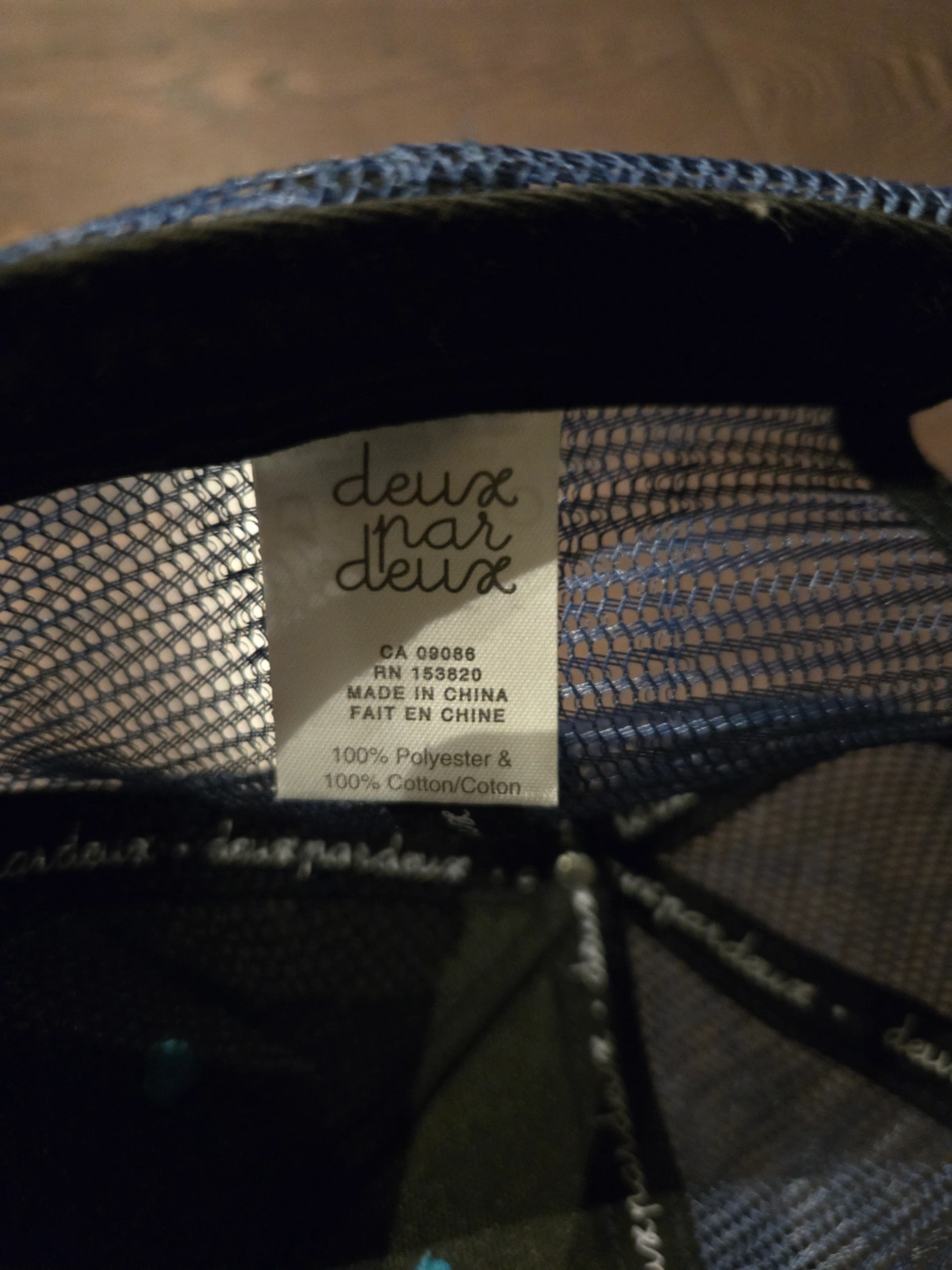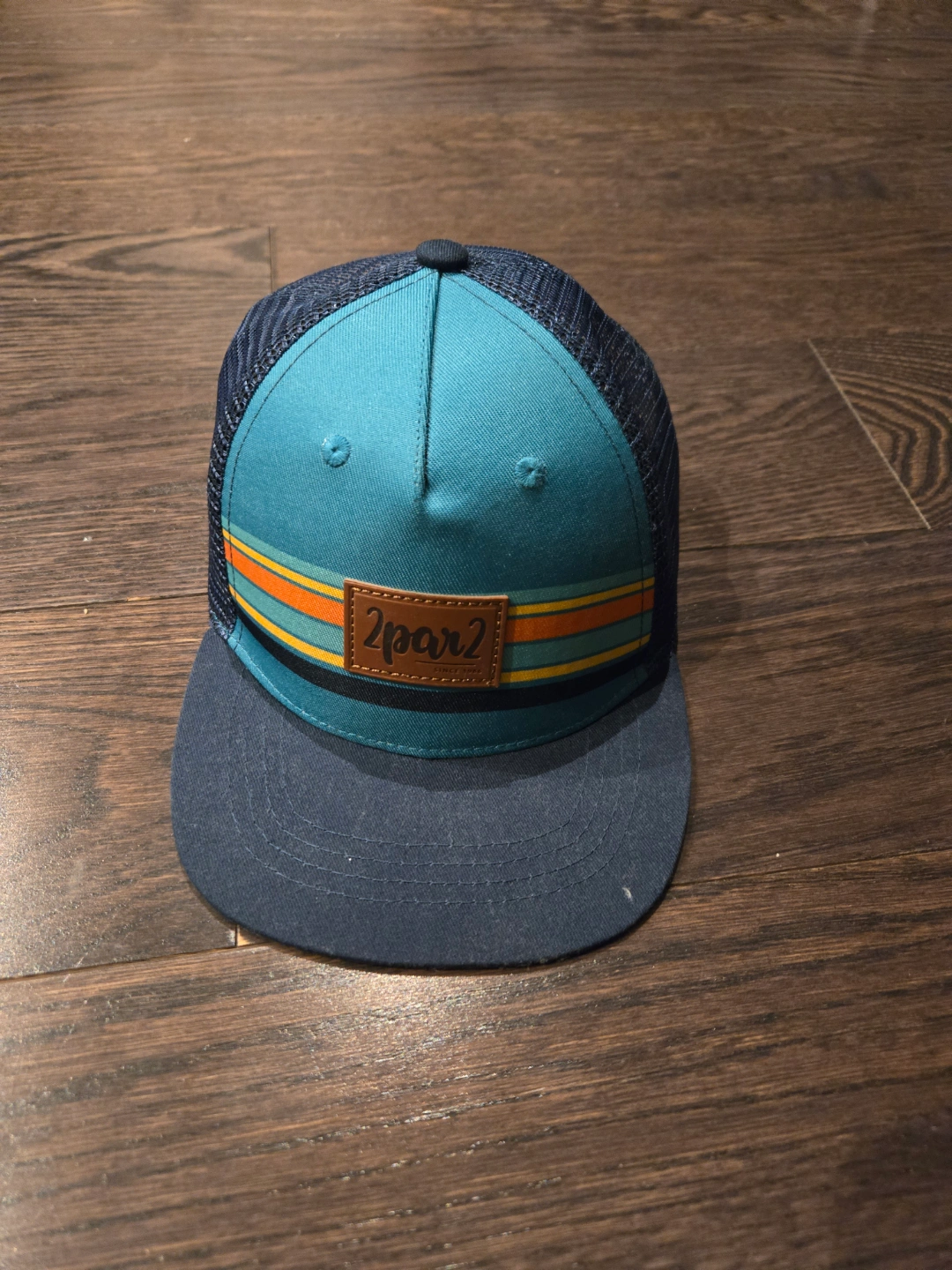 Cute teal and navy blue trucker hat. Features a brown leather-like patch with logo. Adjustable snapback closure. Mesh back. Never Worn. Fits 5 to 7 year old.