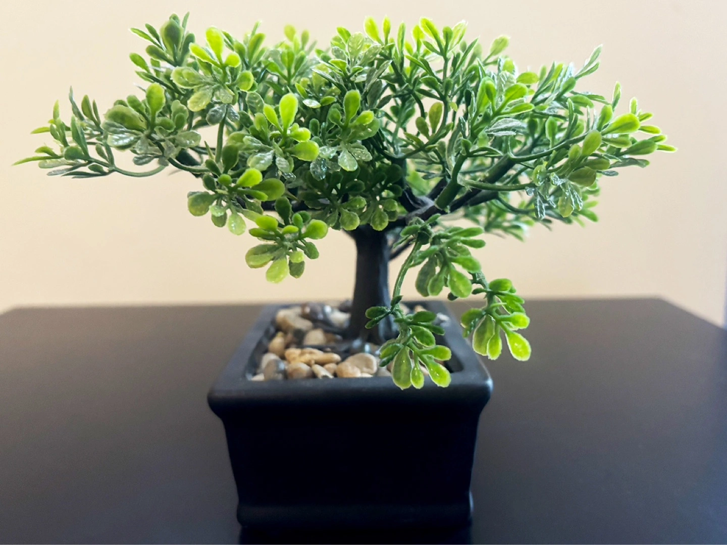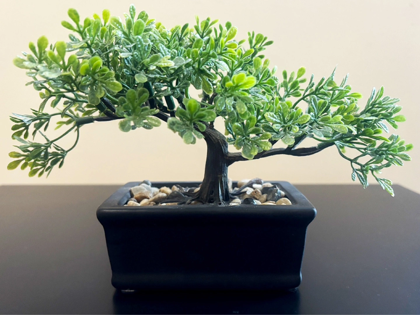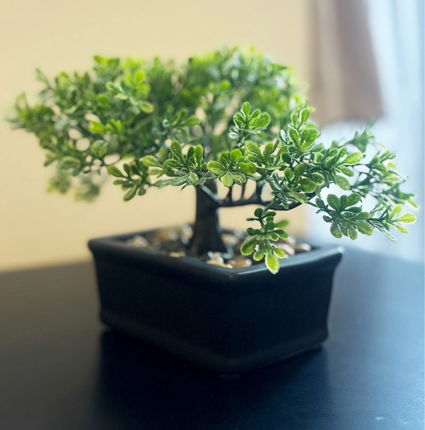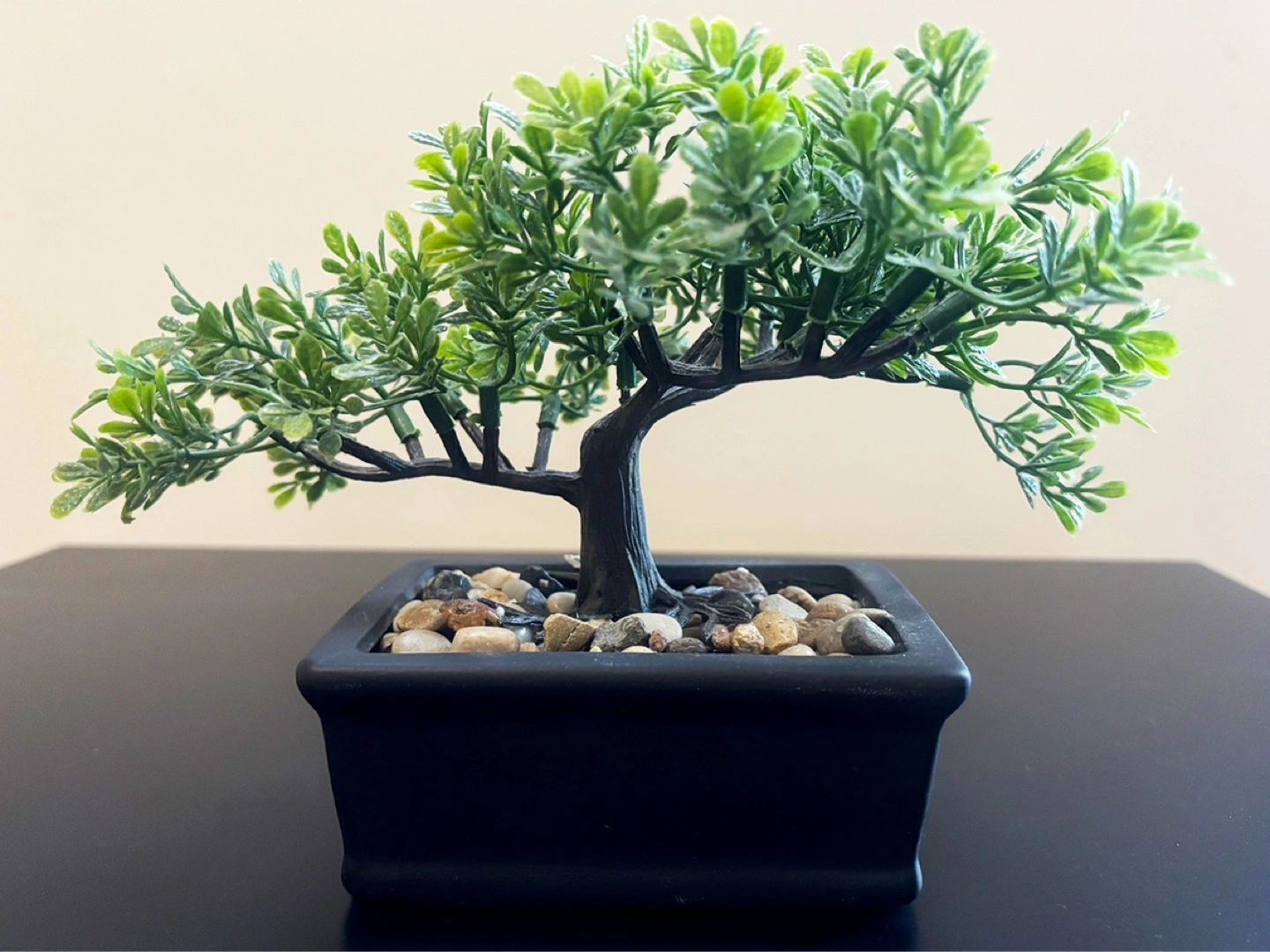 A beautiful mini artificial bonsai tree in a sleek black pot with decorative pebbles. Great for adding zen vibes to your shelf, workspace, or meditation corner.