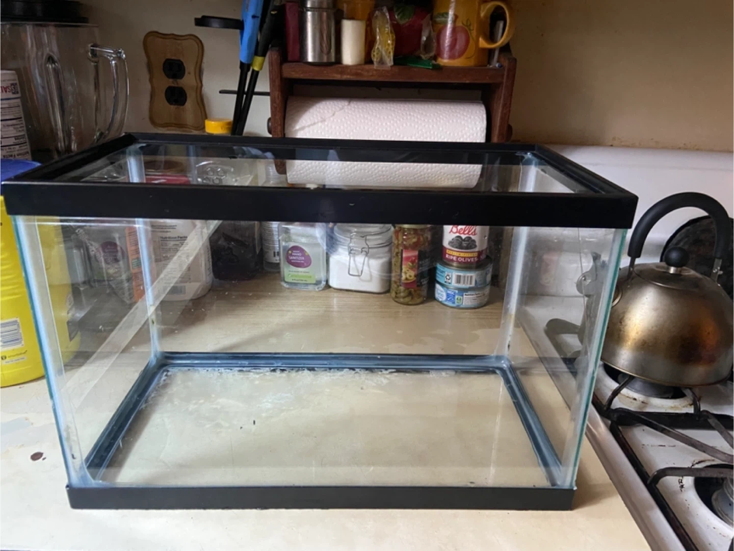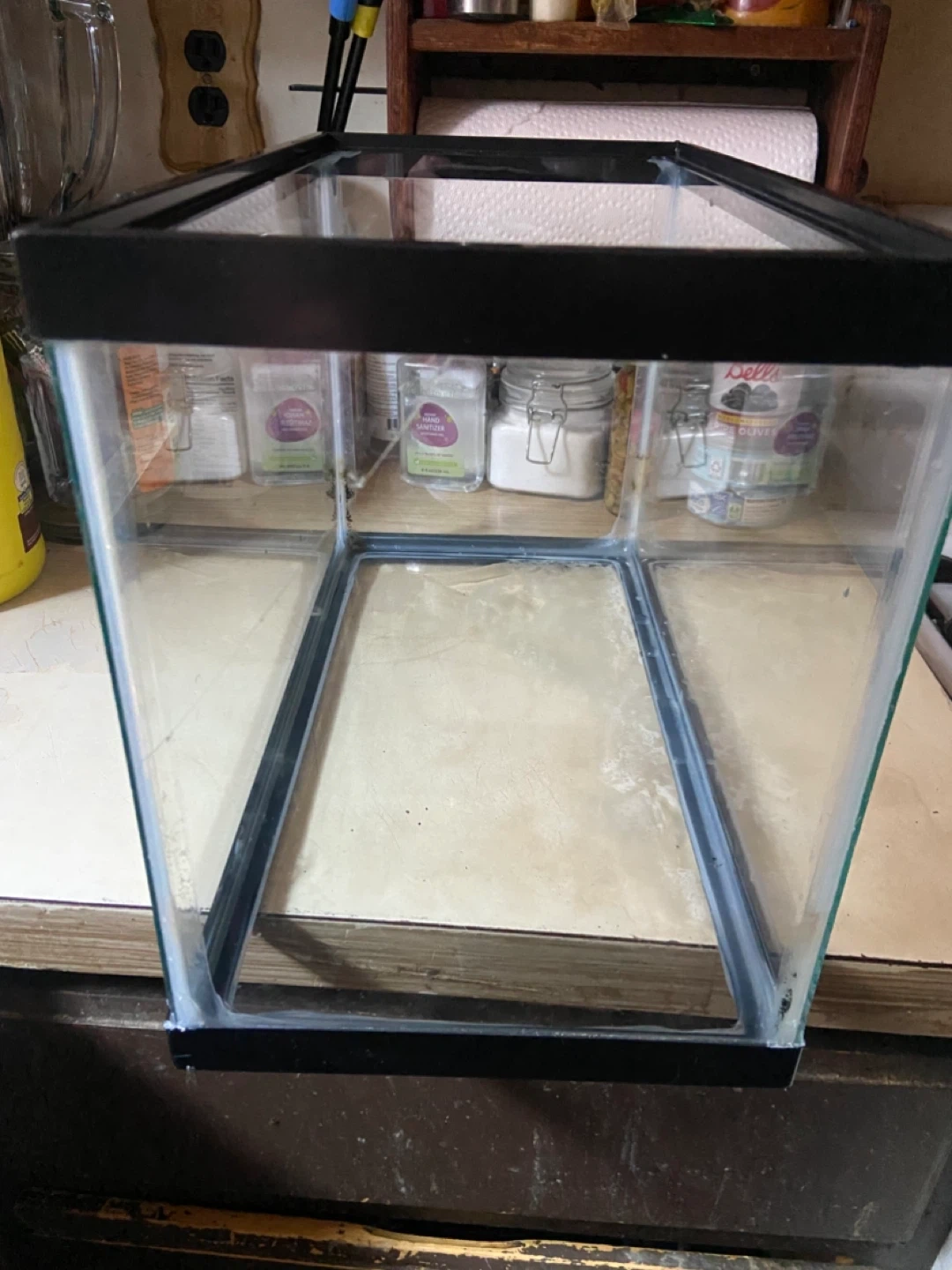 Glass aquarium tank with black trim. It's suitable for fish or other small pets. Tank dimensions are approximately 10 gallons.