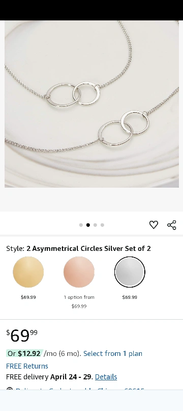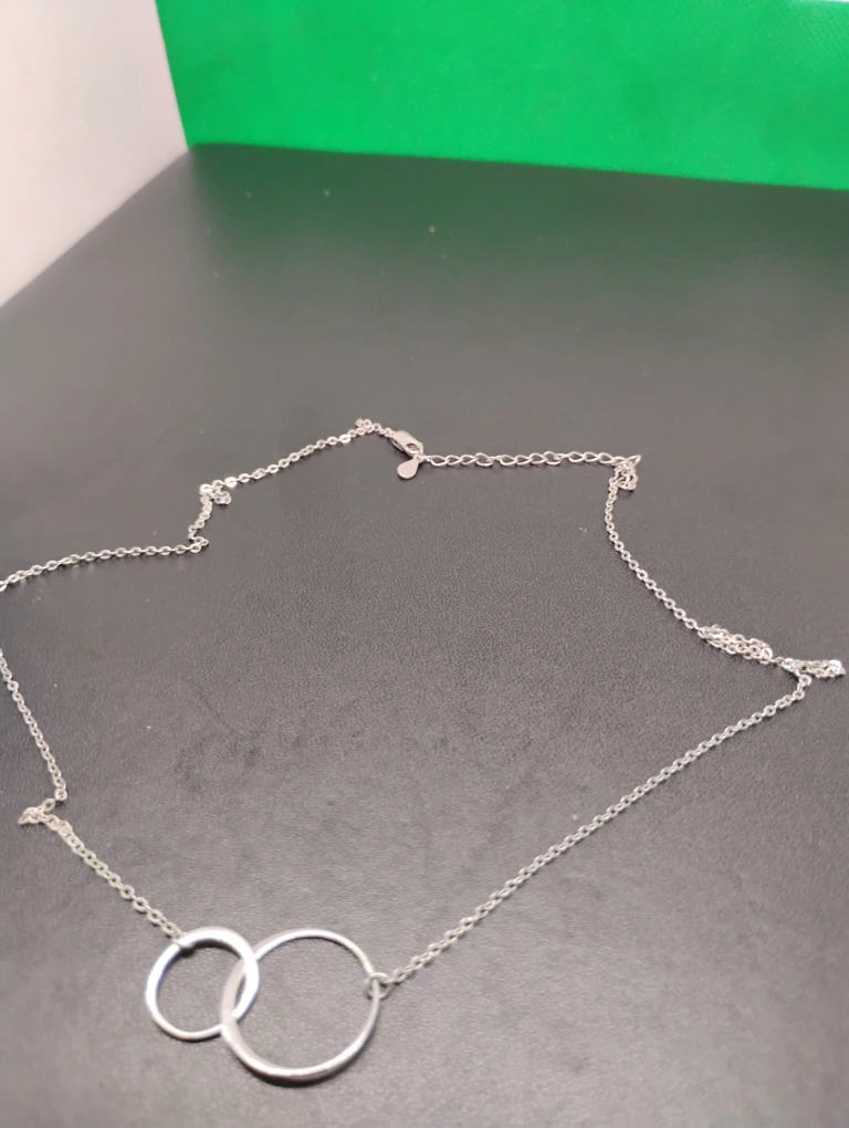 Beautiful silver necklace. Features two interlocking circles pendant. Delicate chain. Great for everyday wear.