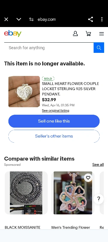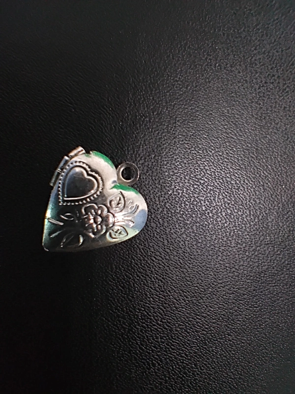 Silver locket pendant. Heart shaped. Features flower design. Opens to reveal interior space. Perfect for a small picture or memento.