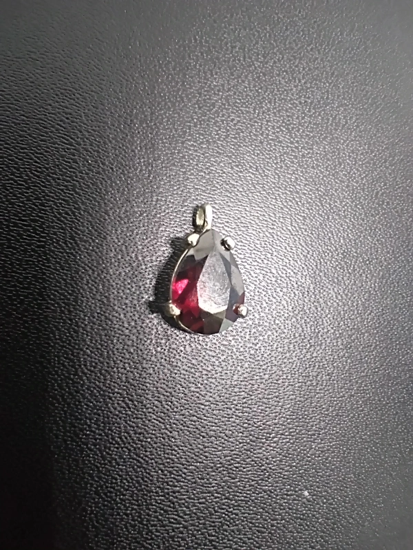Beautiful dark red garnet pear shaped pendant. silver metal setting. Simple design. Elegant accessory.