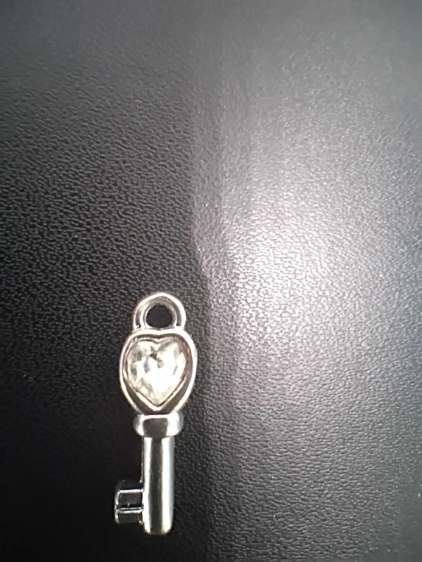 Silver- metal key charm. Features a clear crystal heart. Great for jewelry making.