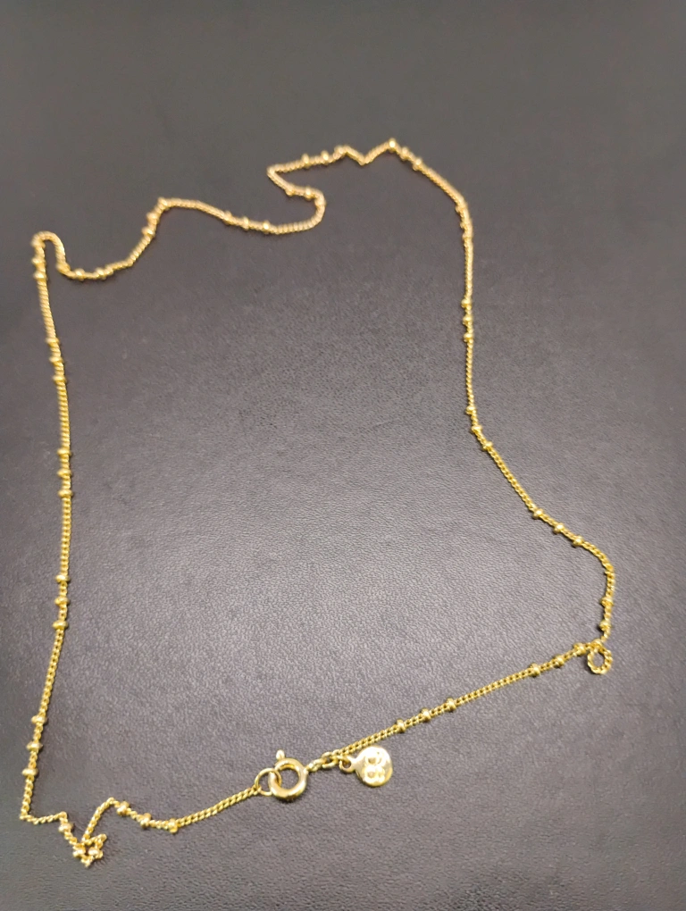 Delicate gold necklace. Features small beads along a thin chain. Lobster clasp closure.