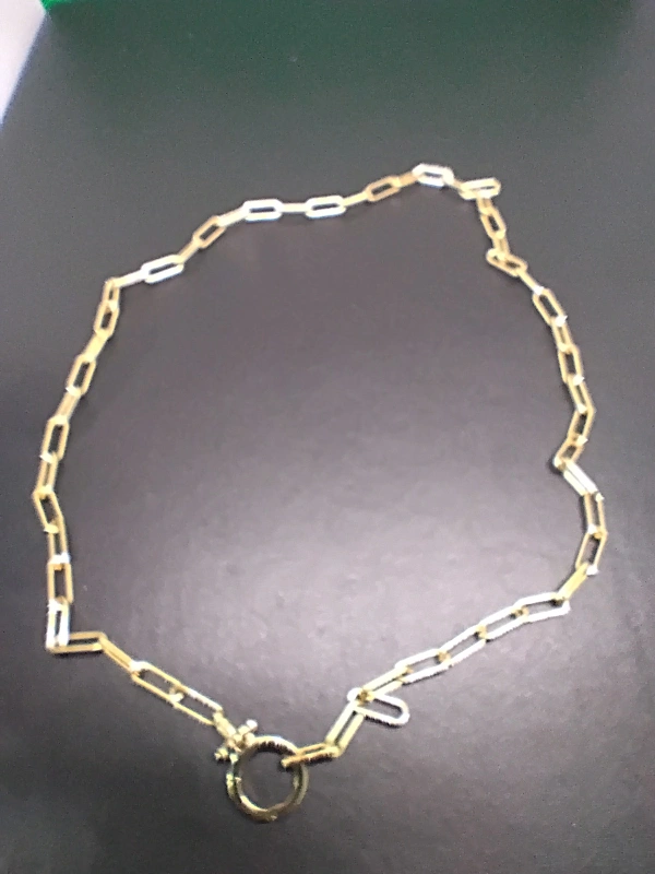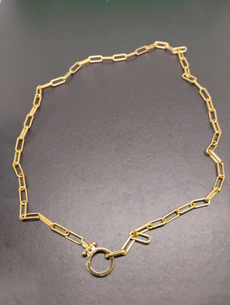 Delicate gold paperclip chain necklace. Features a simple ring clasp. Great layering piece.