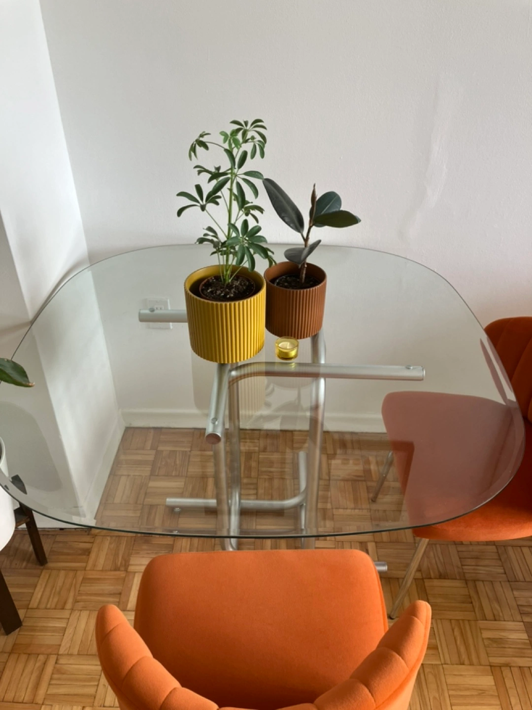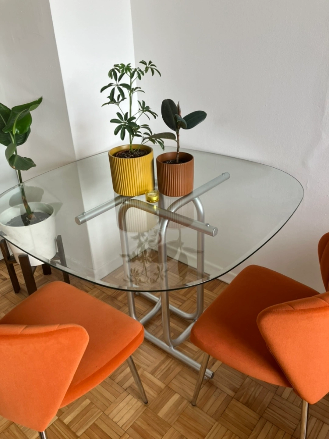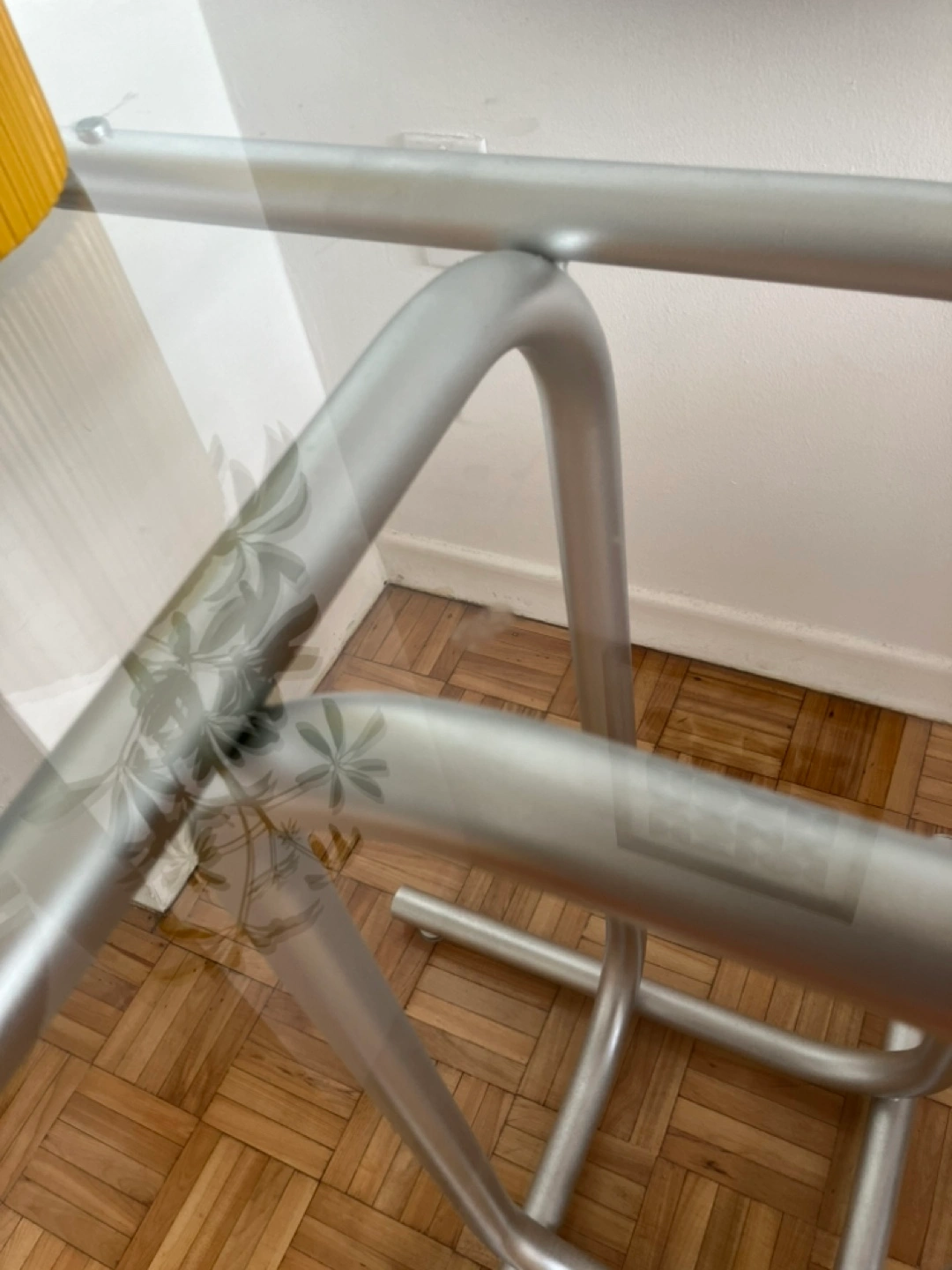 Square with rounded edges. Glass top table with sprayed silver metal base. Minimalist design. Perfect for small spaces. Mid century style. Does have minor wear and tear. Pictured in image. Does not include chairs.