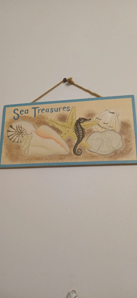 381Rectangular wooden sign. Features seashells, starfish, and seahorse. Light beige background, blue border. Natural twine hanger. Beach-themed home decor.馃 #freecycle