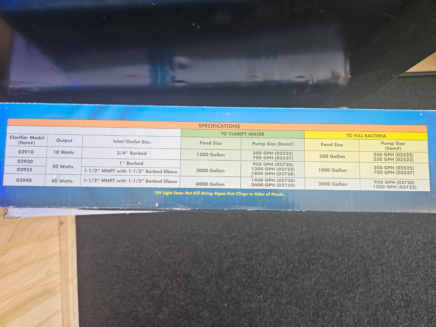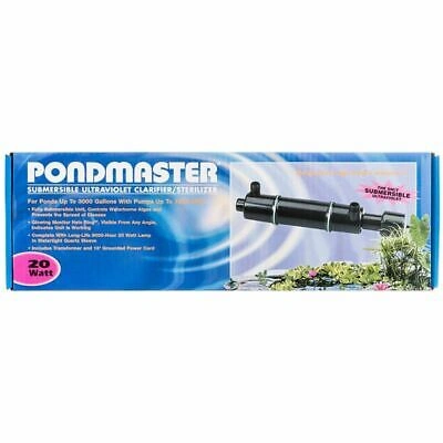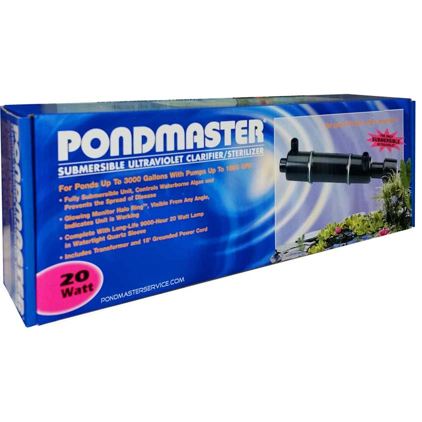 188Submersible UV clarifier/sterilizer. with 18' grounded power cord For ponds up to 3000 gallons. Includes 20-watt lamp Water-resistant Prevents the spread of disease. Glowing halo ring indicates unit is working.
