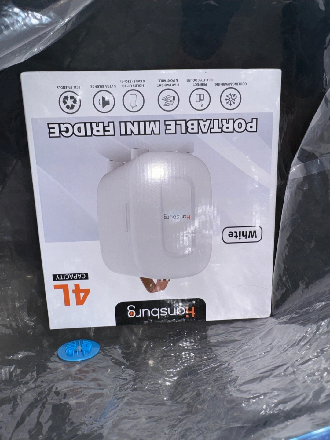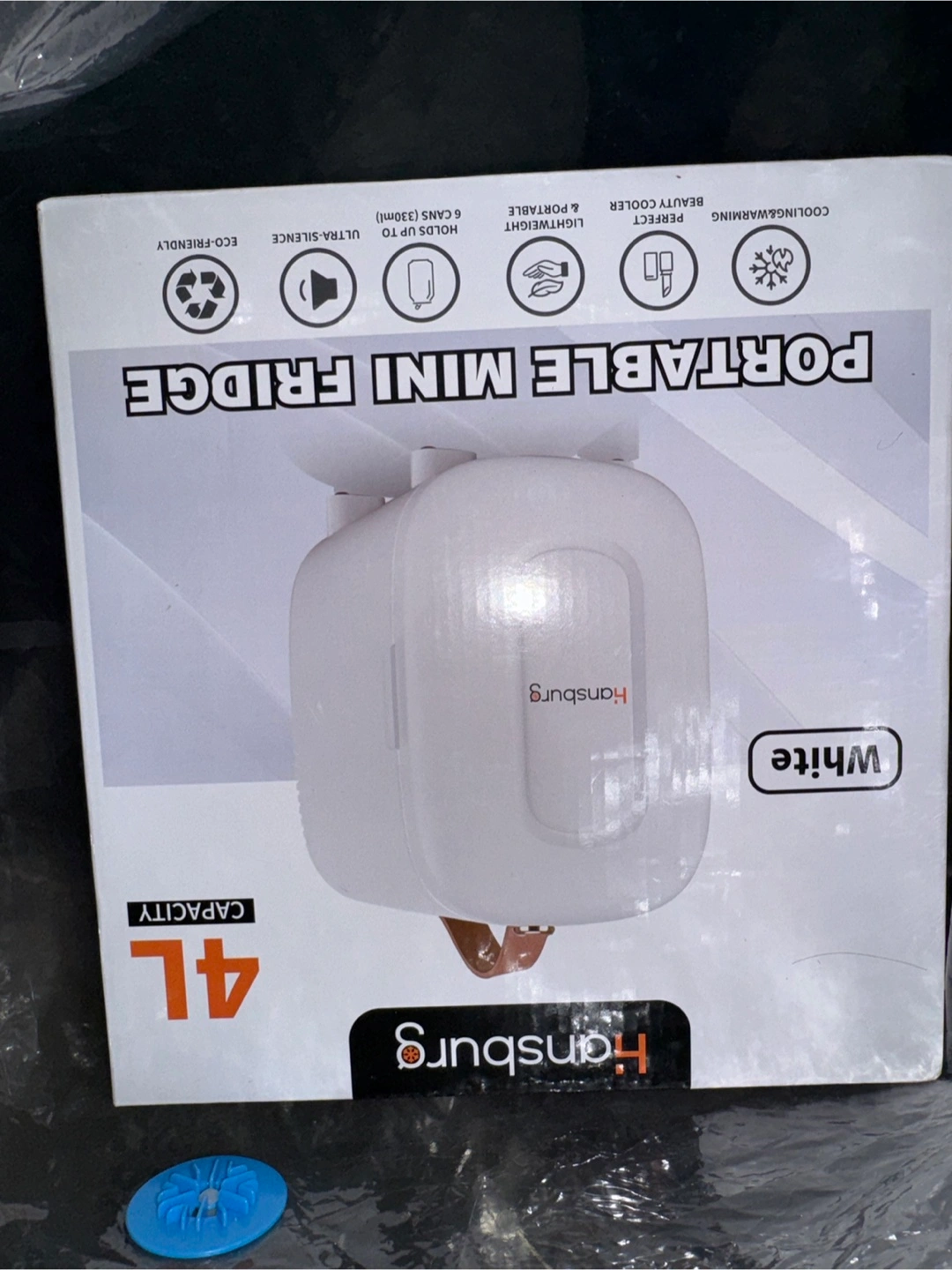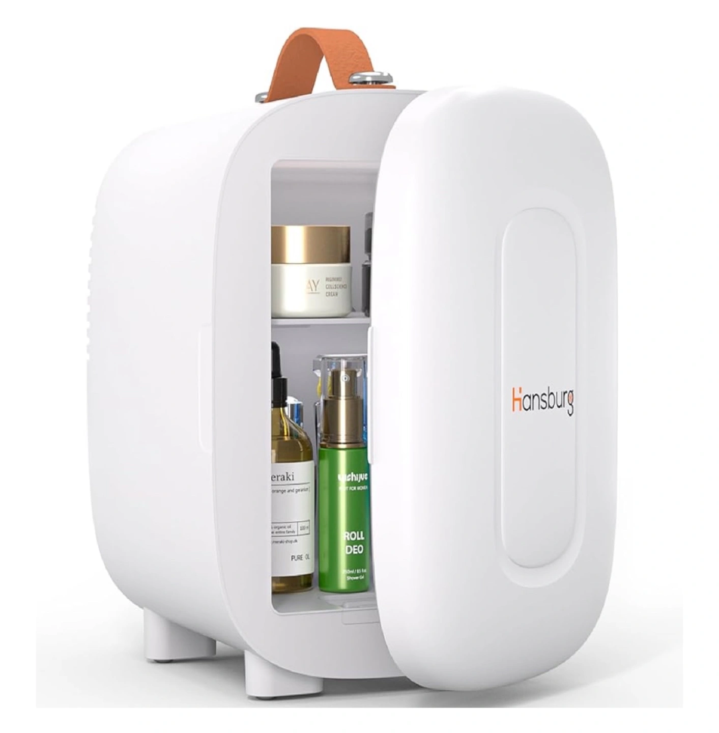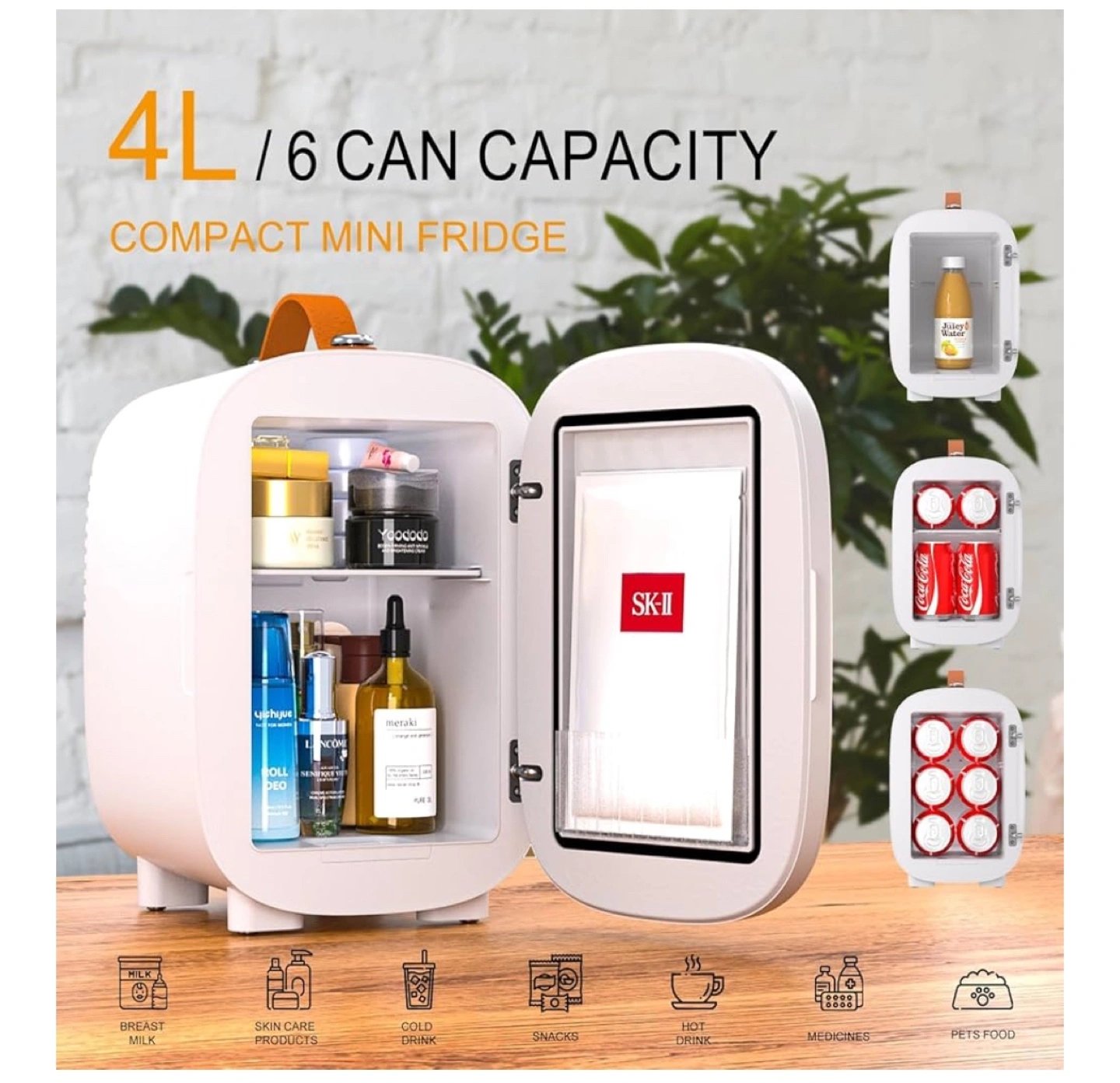 Compact mini fridge. 4L capacity. Holds up to 6 cans. Perfect for beauty products, drinks, and snacks. Lightweight and portable. Eco-friendly.