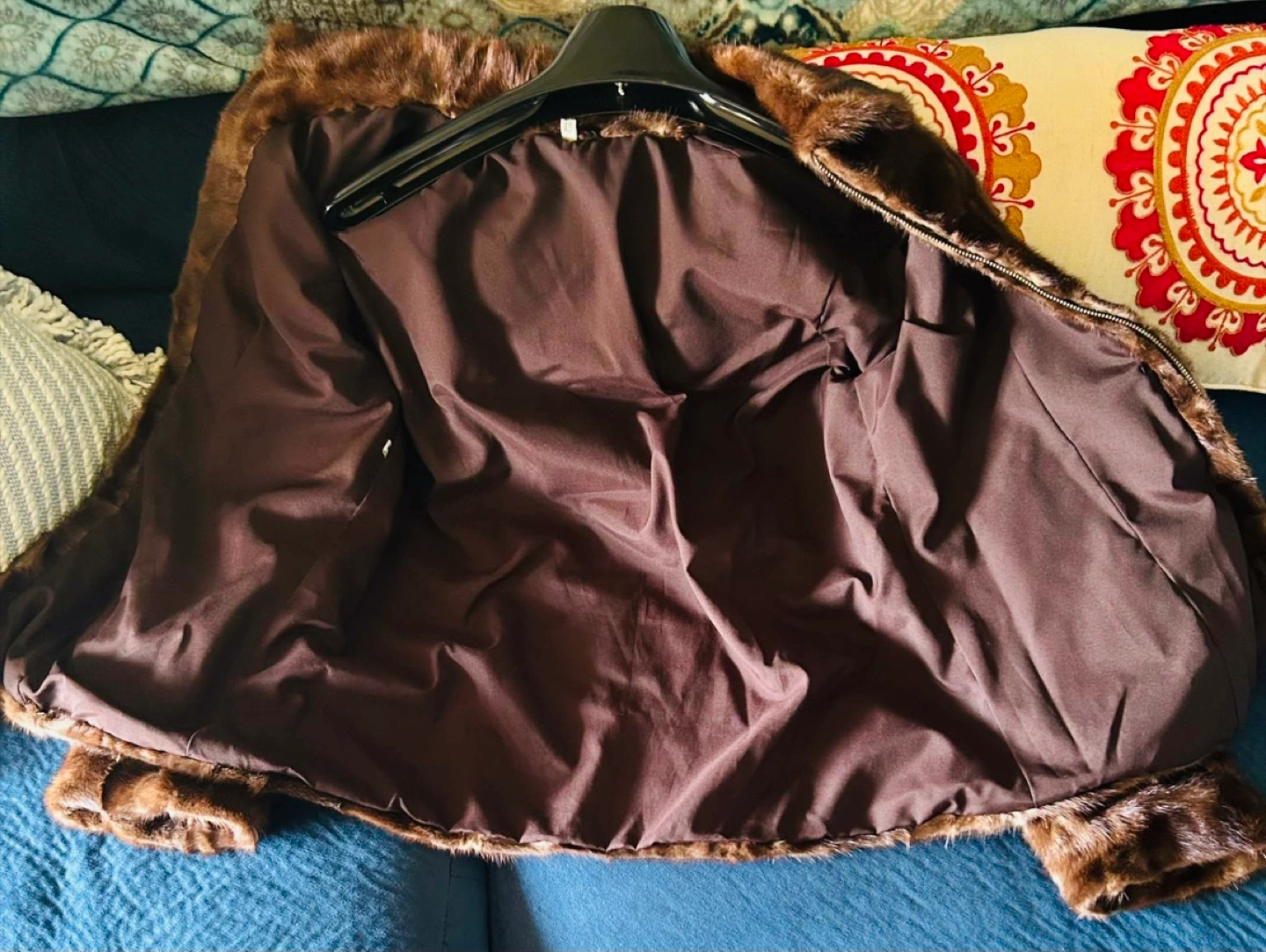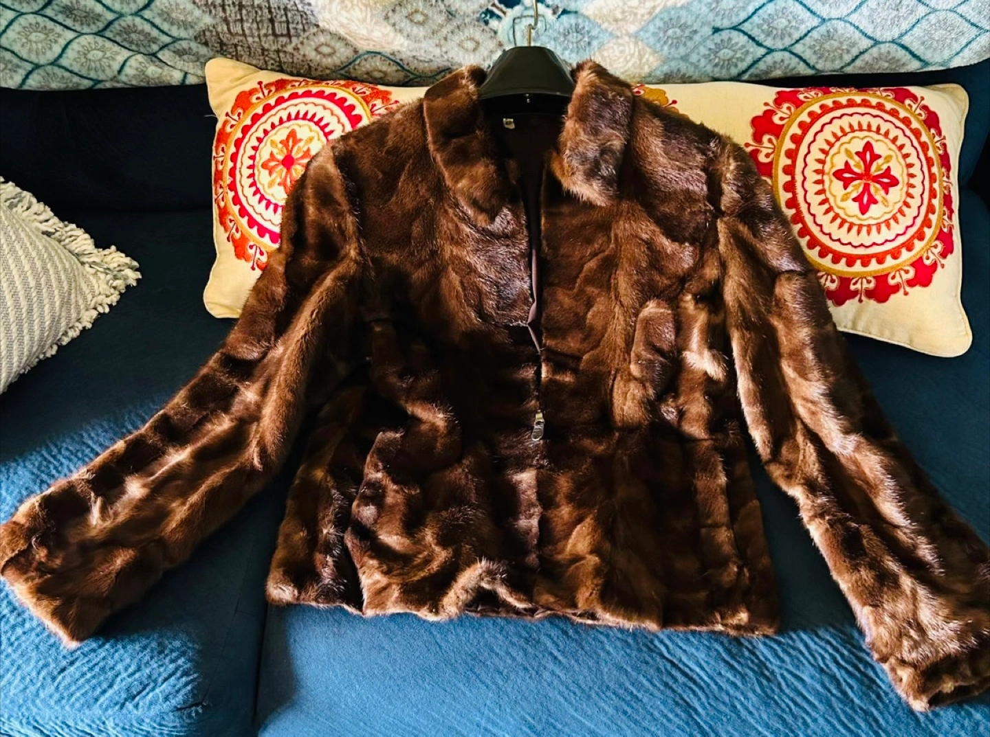 Gorgeous brown short mink fur jacket. Zipper closure. Soft and luxurious.