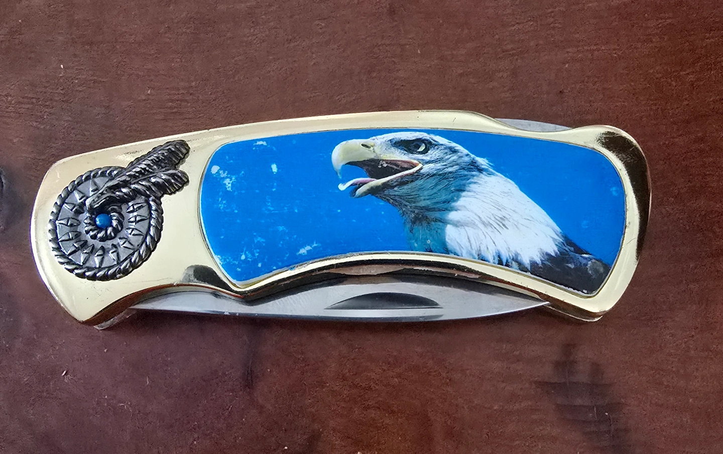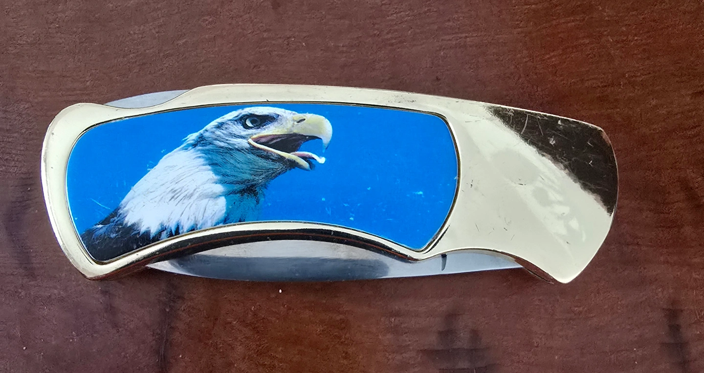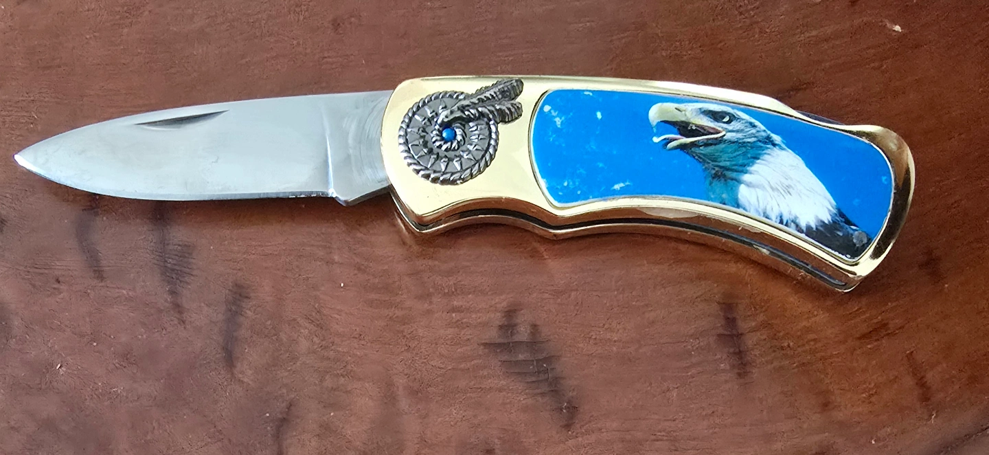 Folding pocket knife. Features a beautiful eagle image on a blue background. Gold-toned handle. Small, lightweight knife. Perfect for everyday carry.
