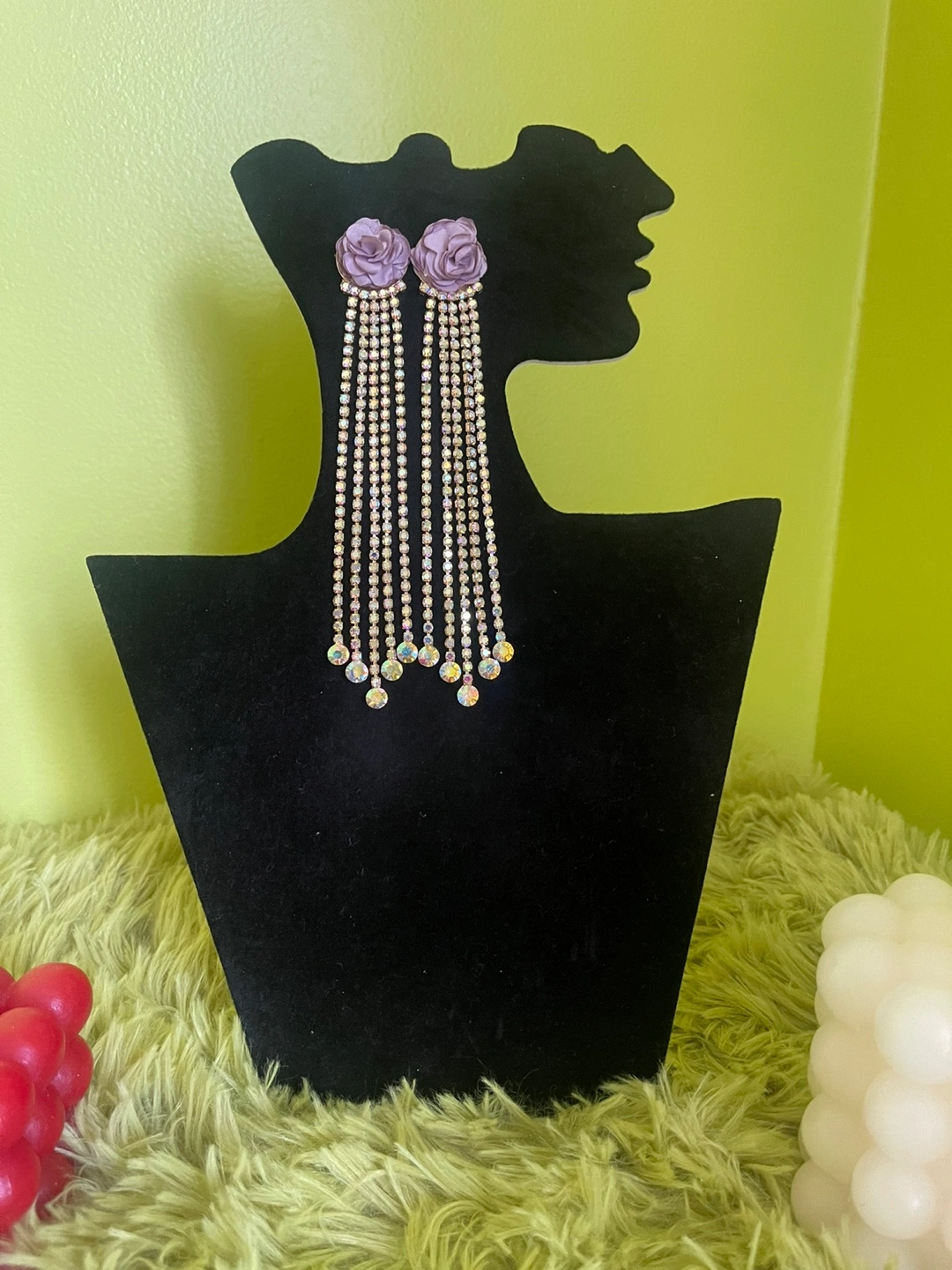Long, sparkly earrings. Features a pretty purple fabric rose accent. Perfect for a night out.