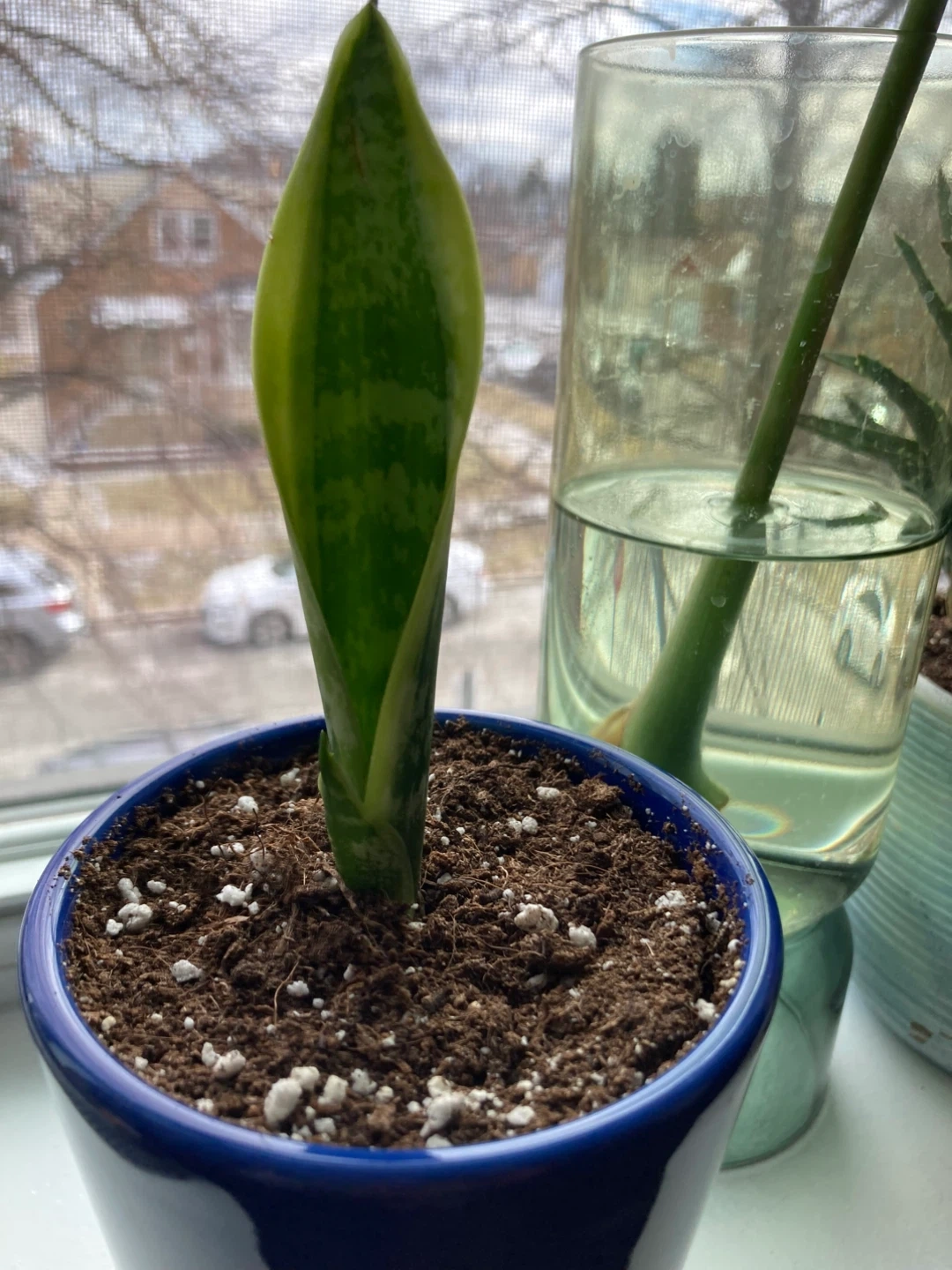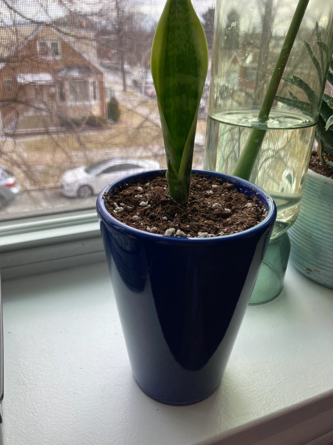 A young snake plant potted in a glossy blue ceramic planter. It's a low-maintenance houseplant. Great for adding a touch of green to any room!
