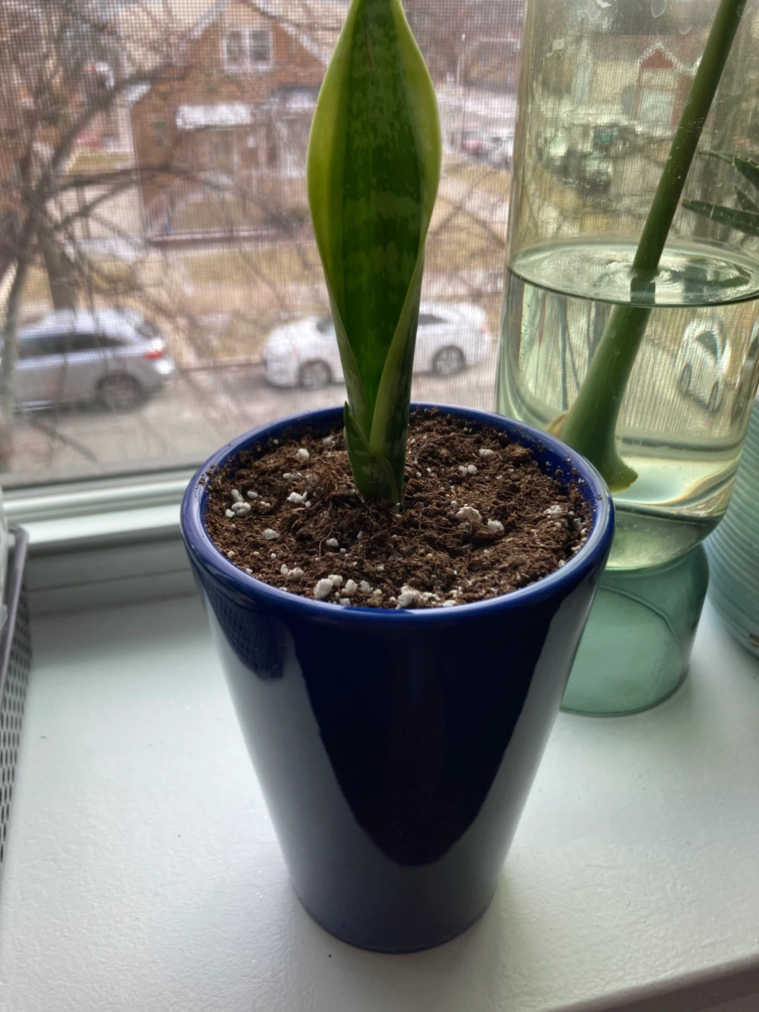 A young snake plant potted in a glossy blue ceramic planter. It's a low-maintenance houseplant. Great for adding a touch of green to any room!