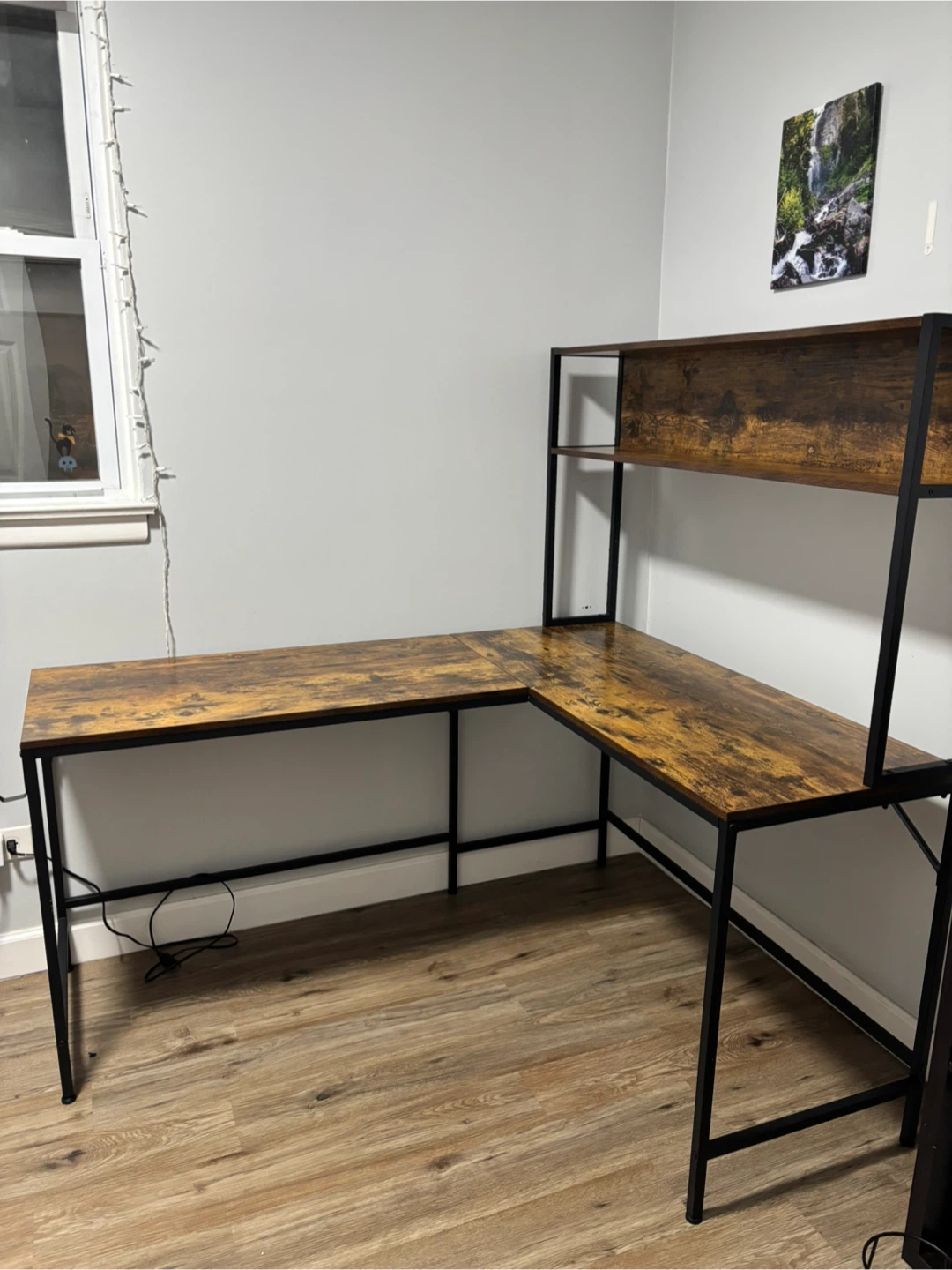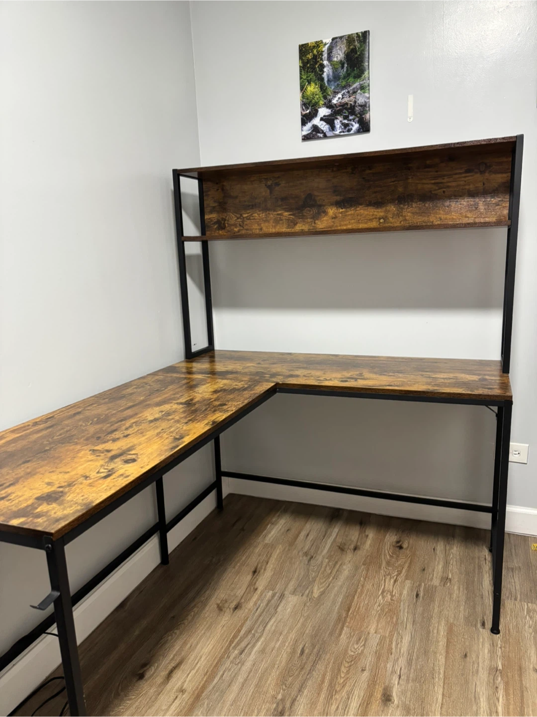 Selling an L-shaped desk with a hutch, perfect for a home office or study space. The desk features a brown wood-grain top with a black metal frame. It's in great condition and ready to use.