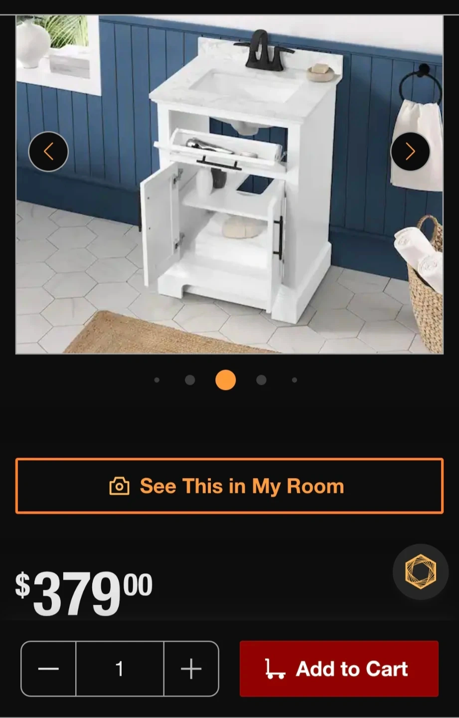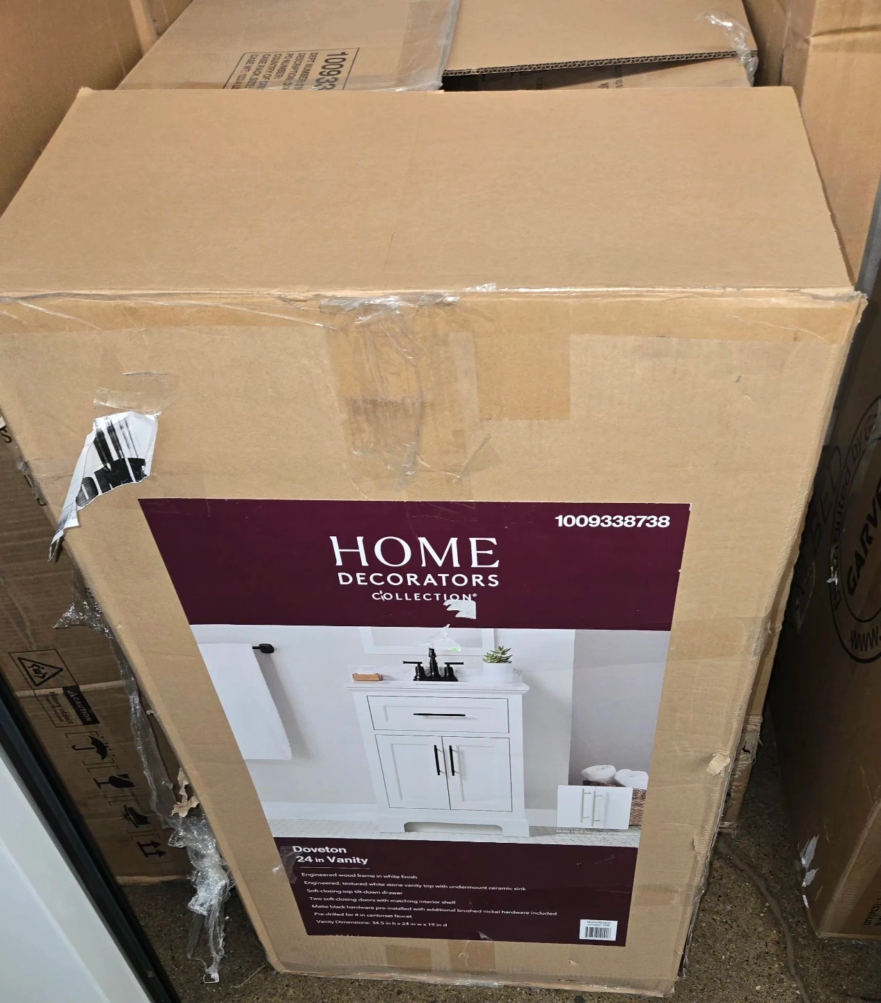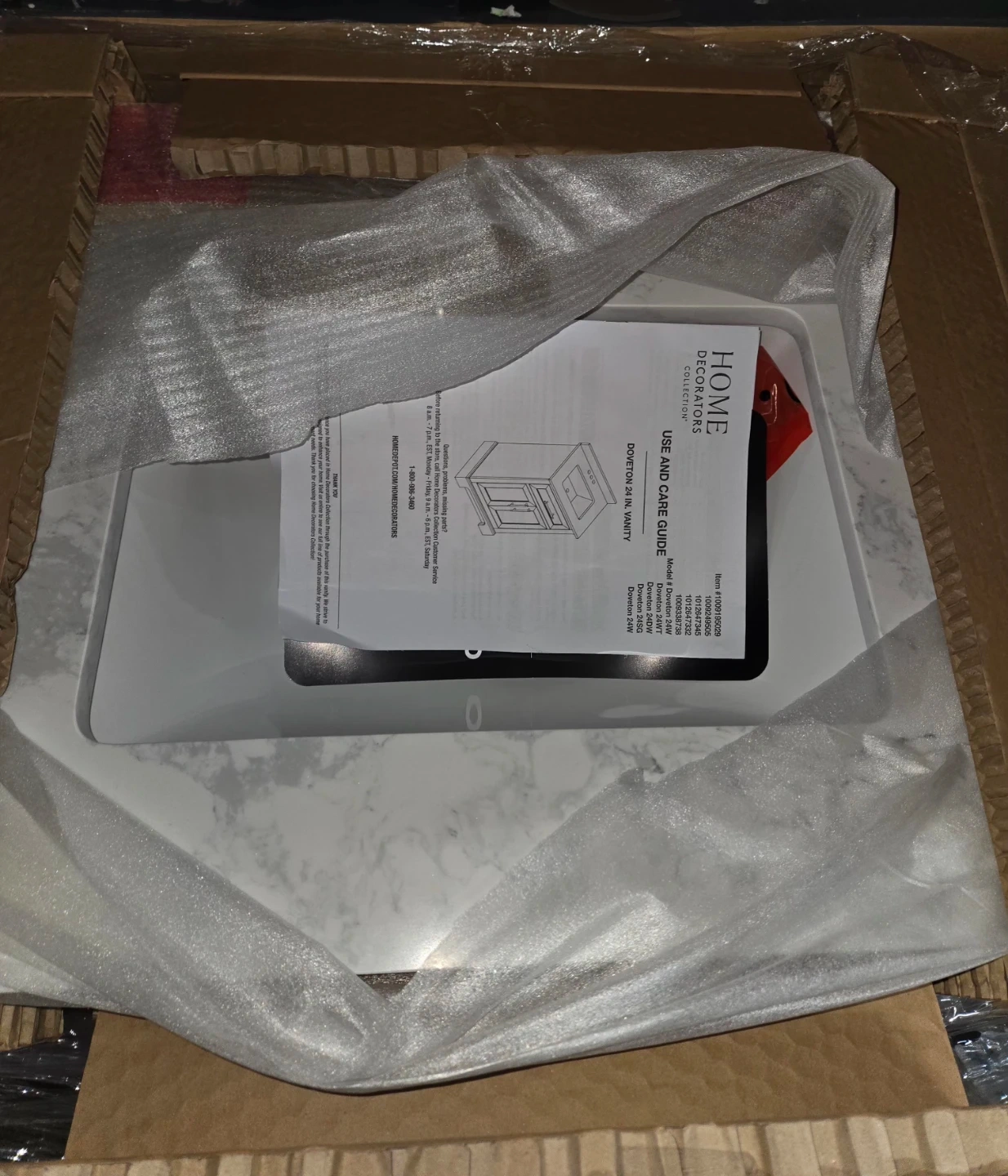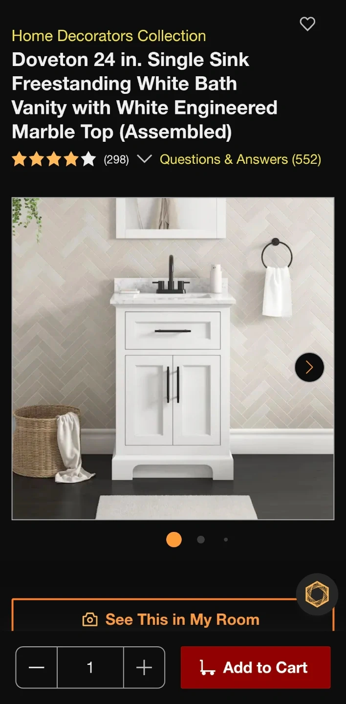 Selling a brand new Home Decorators Collection Doveton 24-inch single sink freestanding white bath vanity with white engineered marble top! It's still in the box and comes with the use and care guide. The vanity is assembled and ready to install. Dimensions are 24" wide, 19" deep, and 34 1/2" high. Originally bought for $379