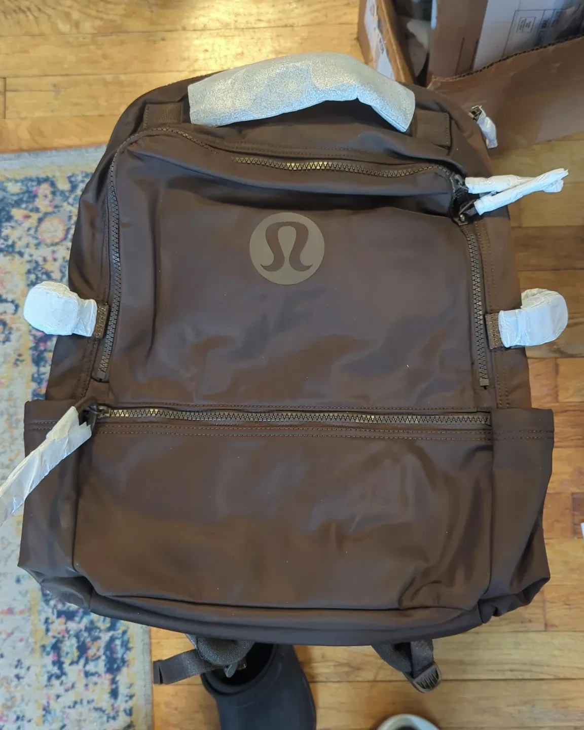 This is a Lululemon backpack in a brown color. It has multiple zippered compartments and side pockets for easy access. It's perfect for everyday use or travel!