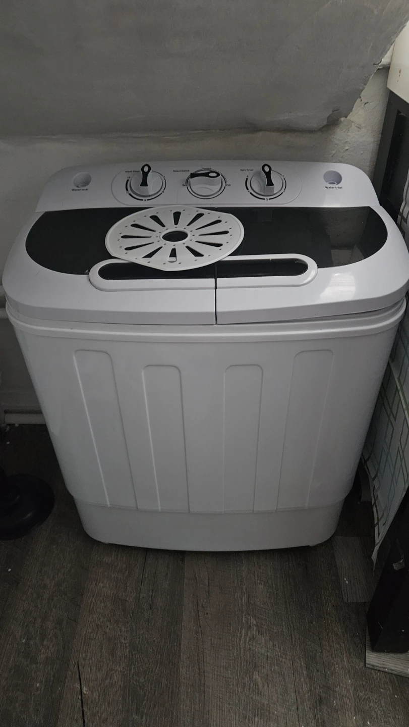 This is a portable twin tub washing machine. It's white and has a compact design. Features three control knobs for wash timer, select spin, and spin timer. Comes with a drain hose and a filter screen.