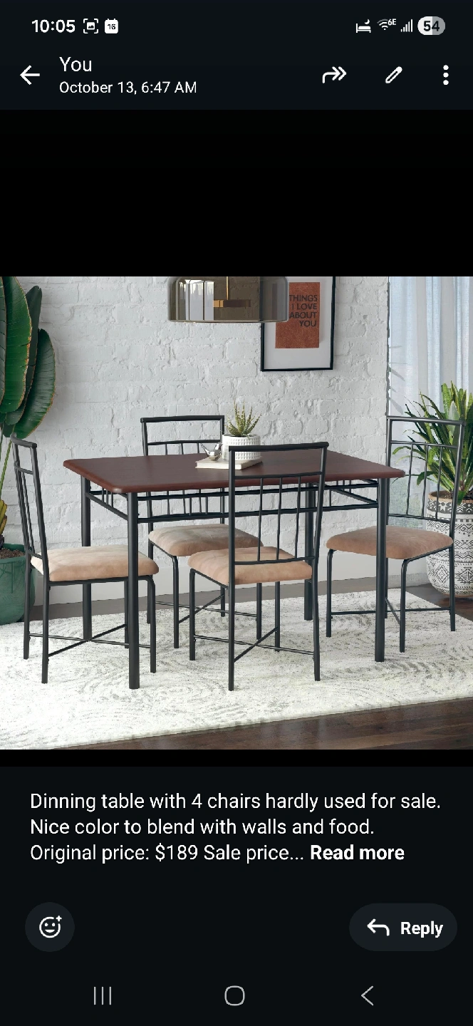 Selling a dining table with four chairs that's hardly been used! It has a nice color that blends well with walls and food. Originally priced at $189