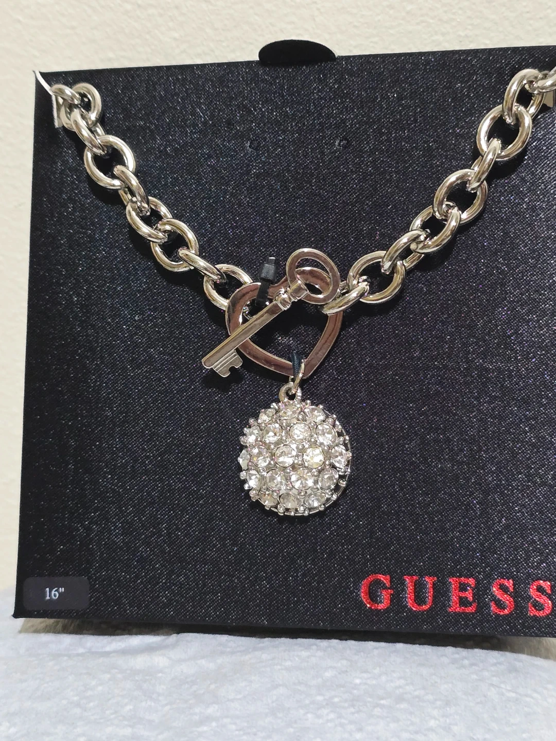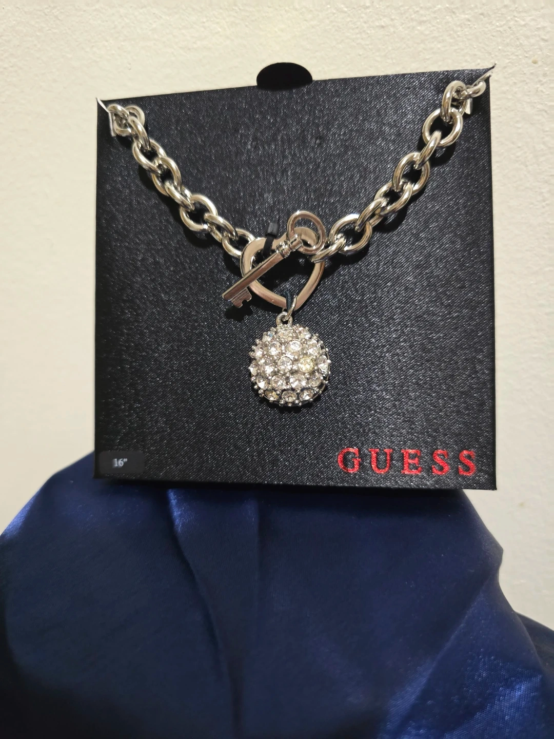 This Guess necklace features a silver-tone chunky chain with a heart toggle closure. It includes a dazzling crystal ball pendant for extra sparkle. The necklace is 16" in length.