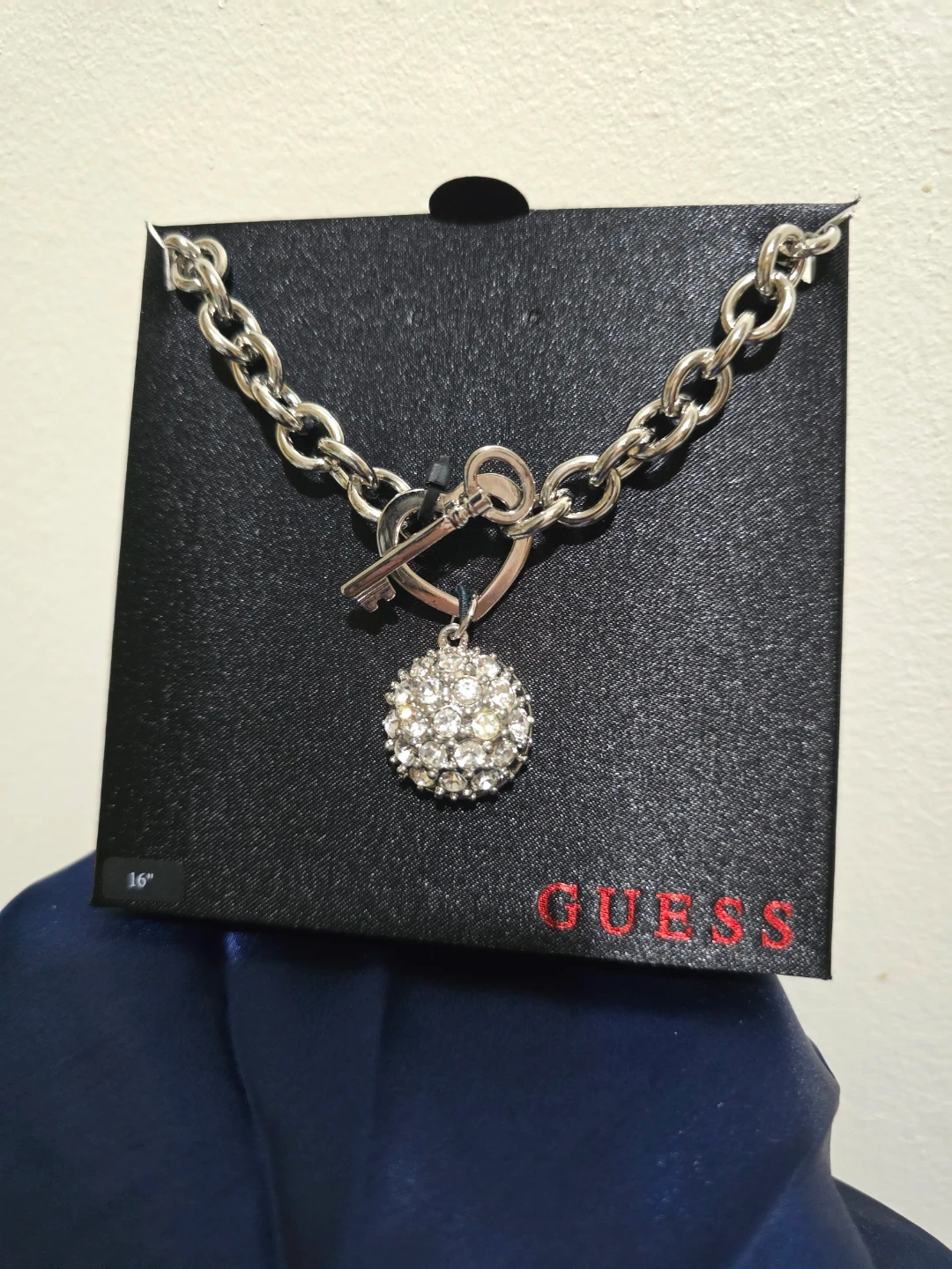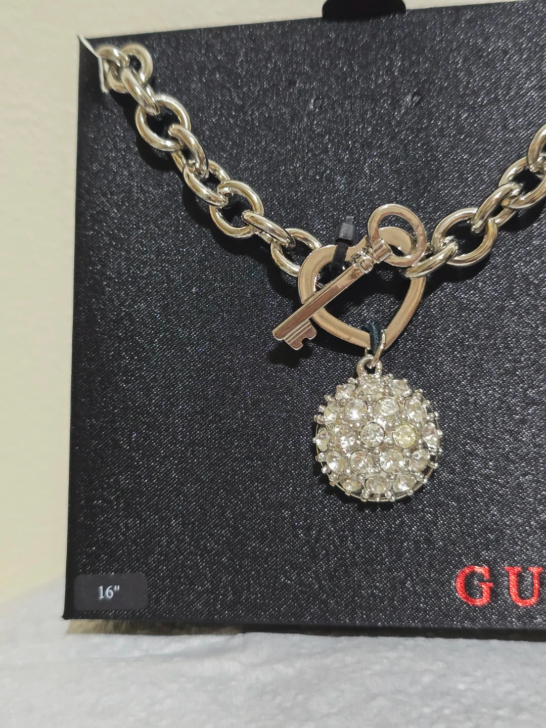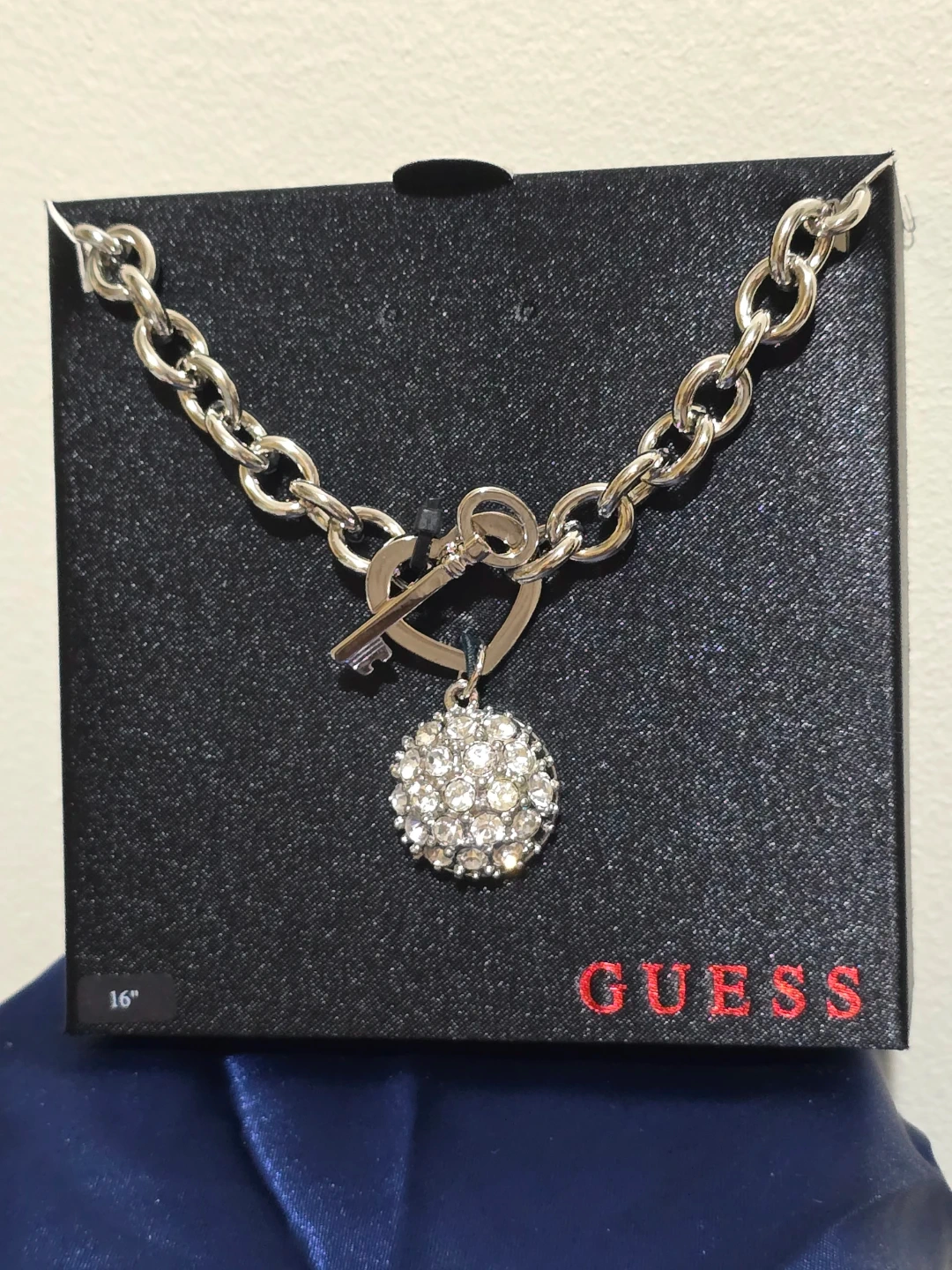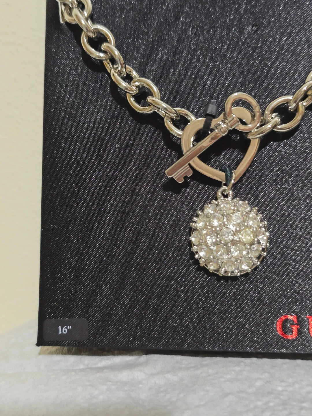 This Guess necklace features a silver-tone chunky chain with a heart toggle closure. It includes a dazzling crystal ball pendant for extra sparkle. The necklace is 16" in length.