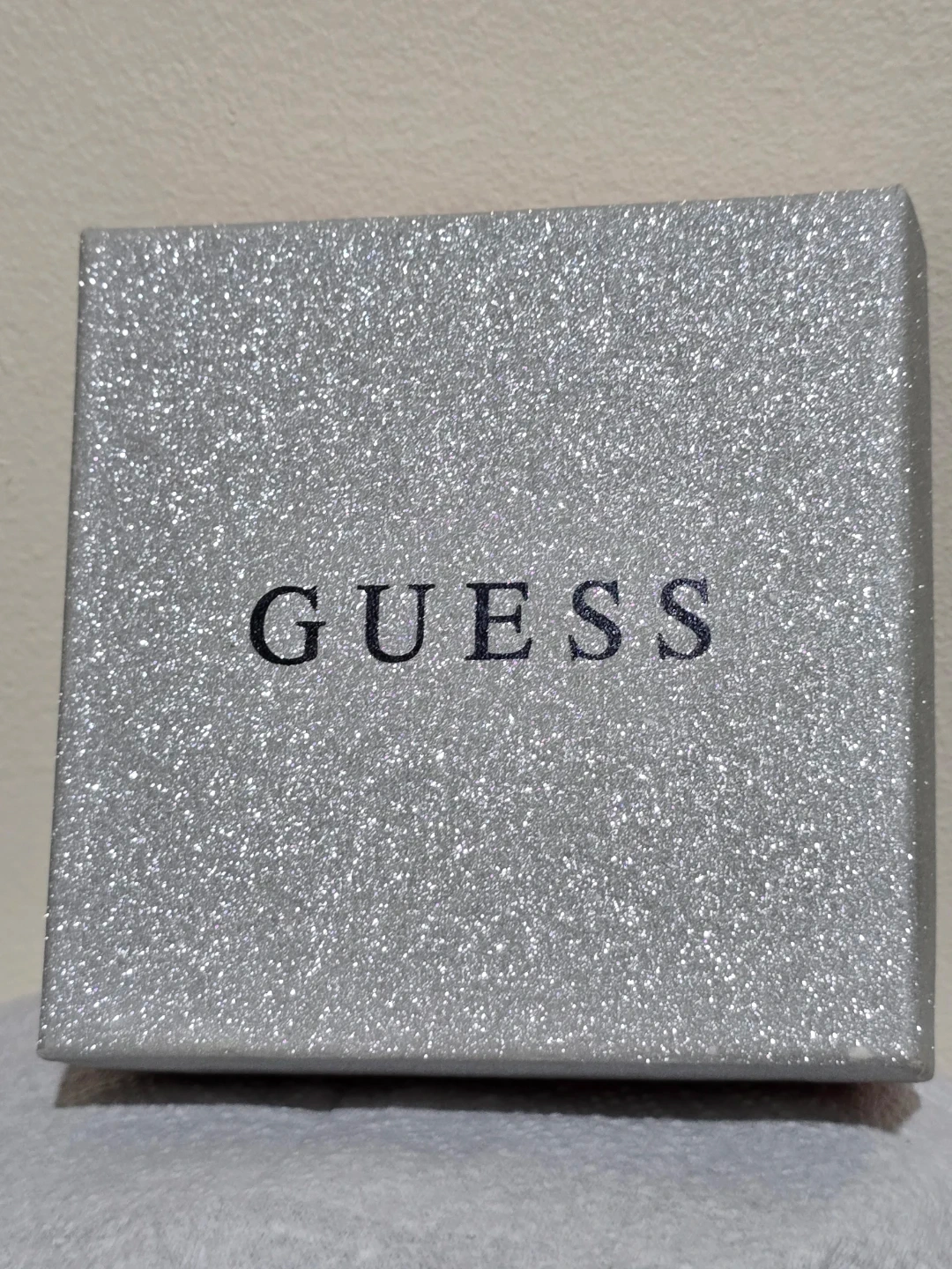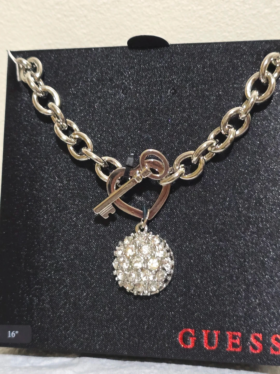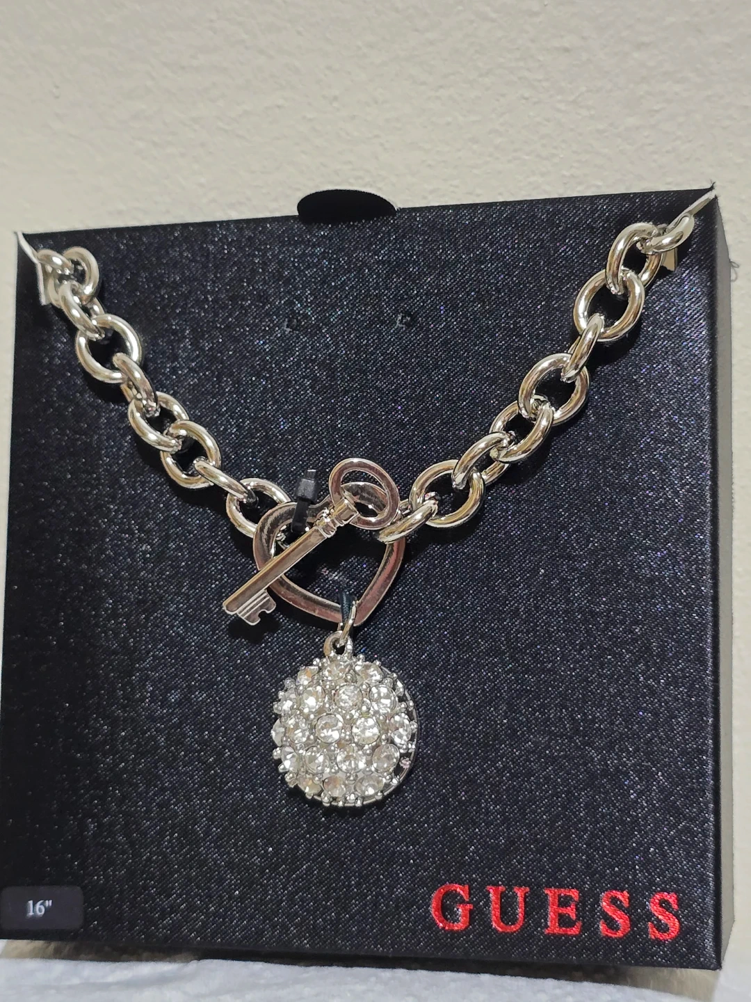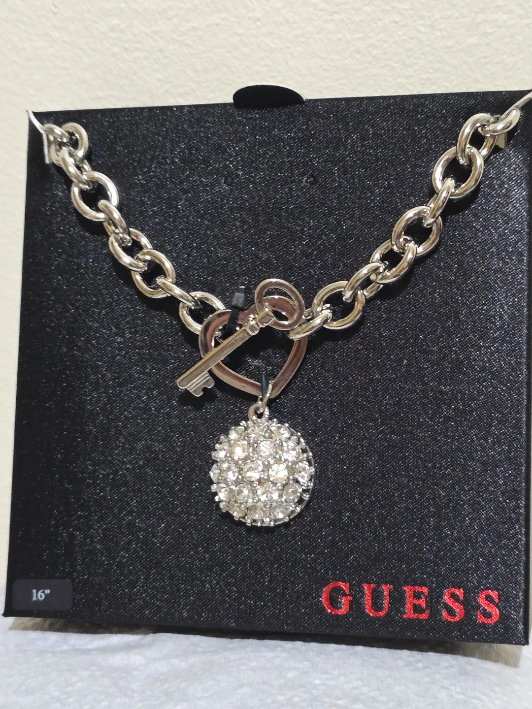 This Guess necklace features a silver-tone chunky chain with a heart toggle closure. It includes a dazzling crystal ball pendant for extra sparkle. The necklace is 16" in length.