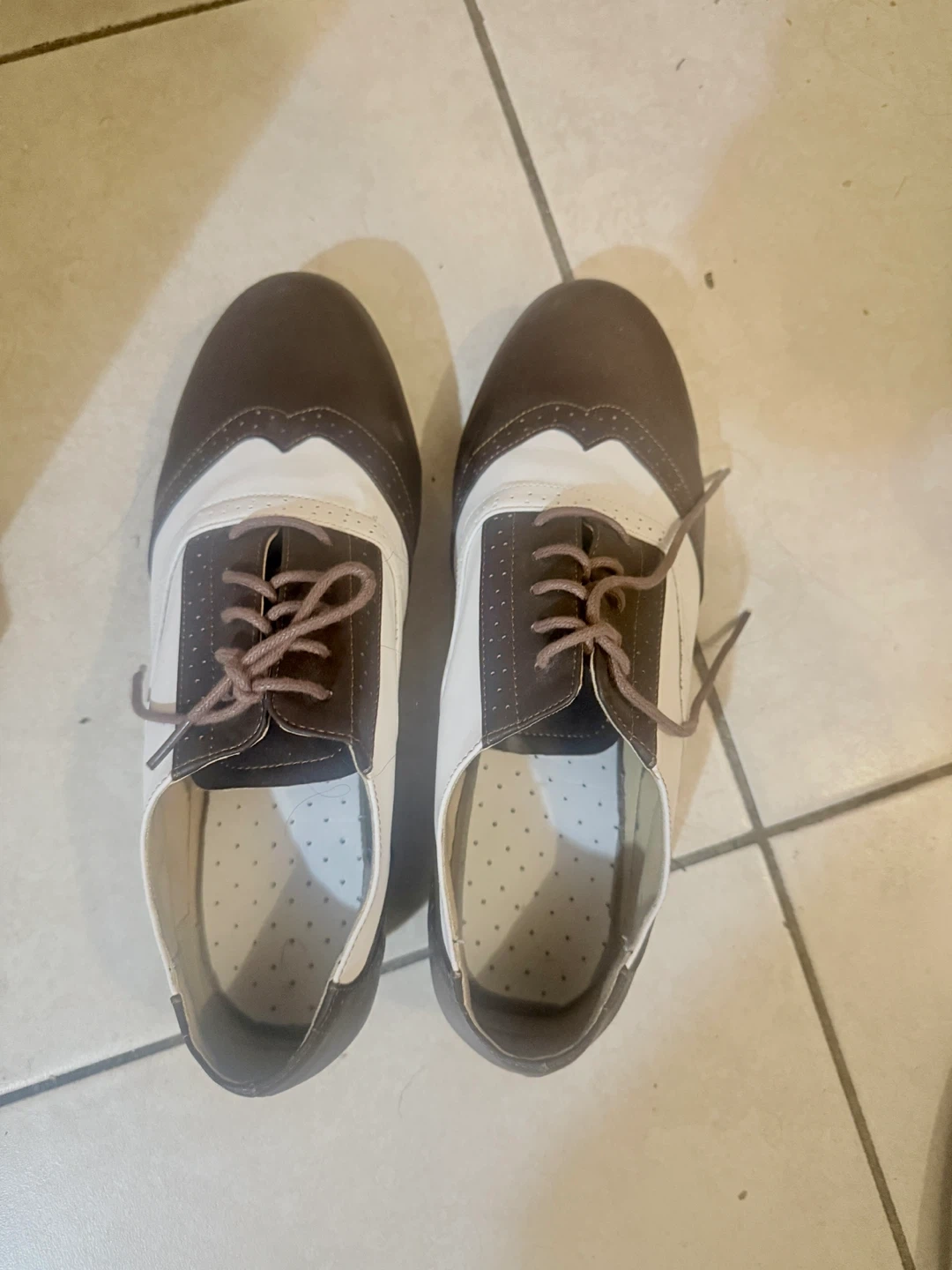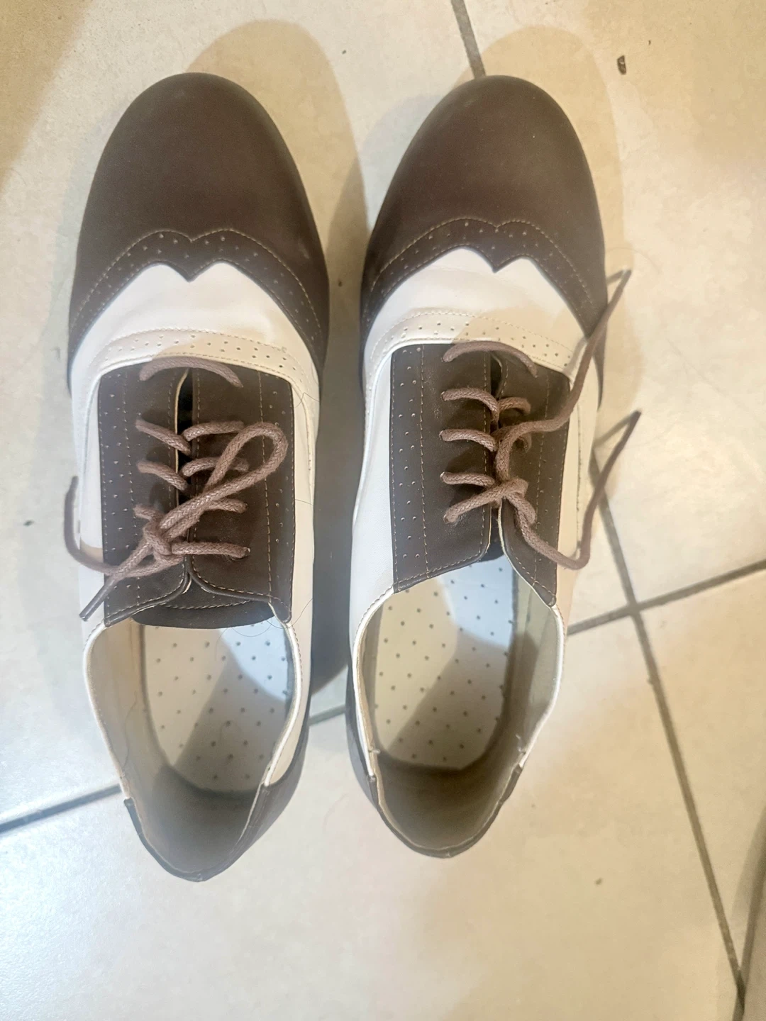 These classic men's oxford shoes feature a stylish wingtip design with brown and white accents. They have a lace-up closure for a secure fit. A timeless choice for formal or semi-formal occasions!
