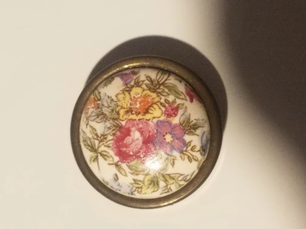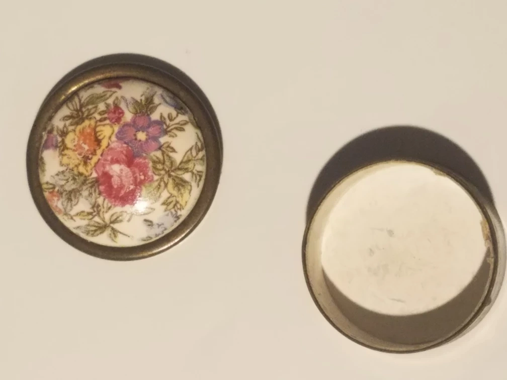 This is a small round trinket box with a decorative floral lid. The lid features a colorful floral pattern on a white background, set within a brass-toned rim. The base of the box is also brass-toned. It's perfect for storing small jewelry items or keepsakes!