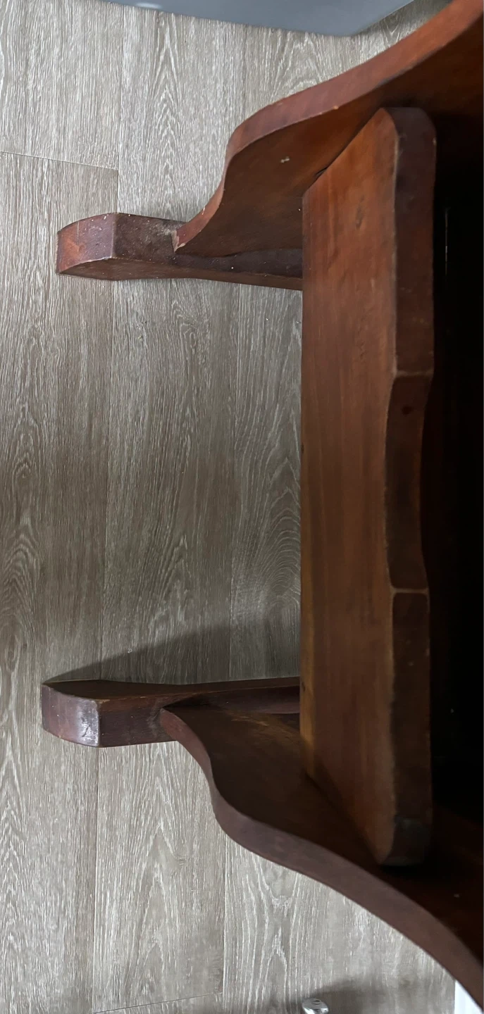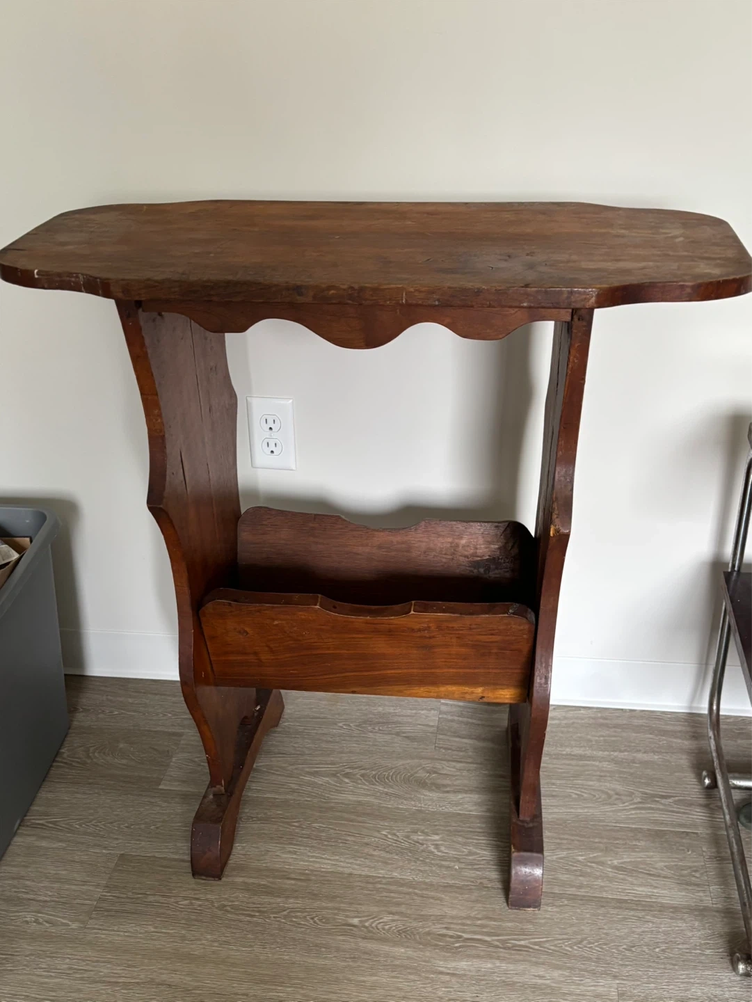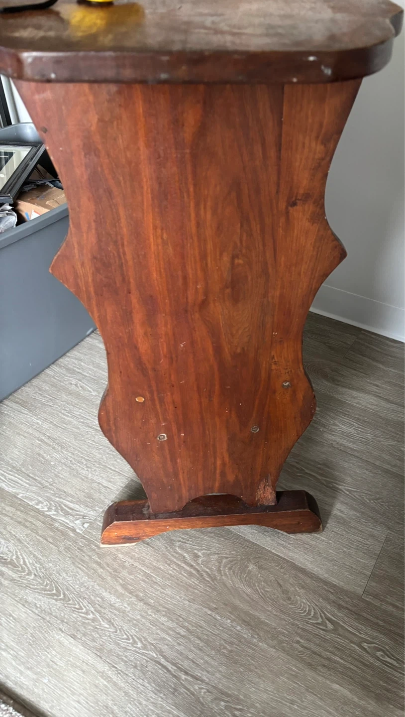 This is a vintage wooden accent table. It stands 34 inches tall and is 32 inches at its widest. It features a carved design on the sides and a convenient magazine rack below the tabletop. The wood has a warm, aged patina. The price reflects the pics.