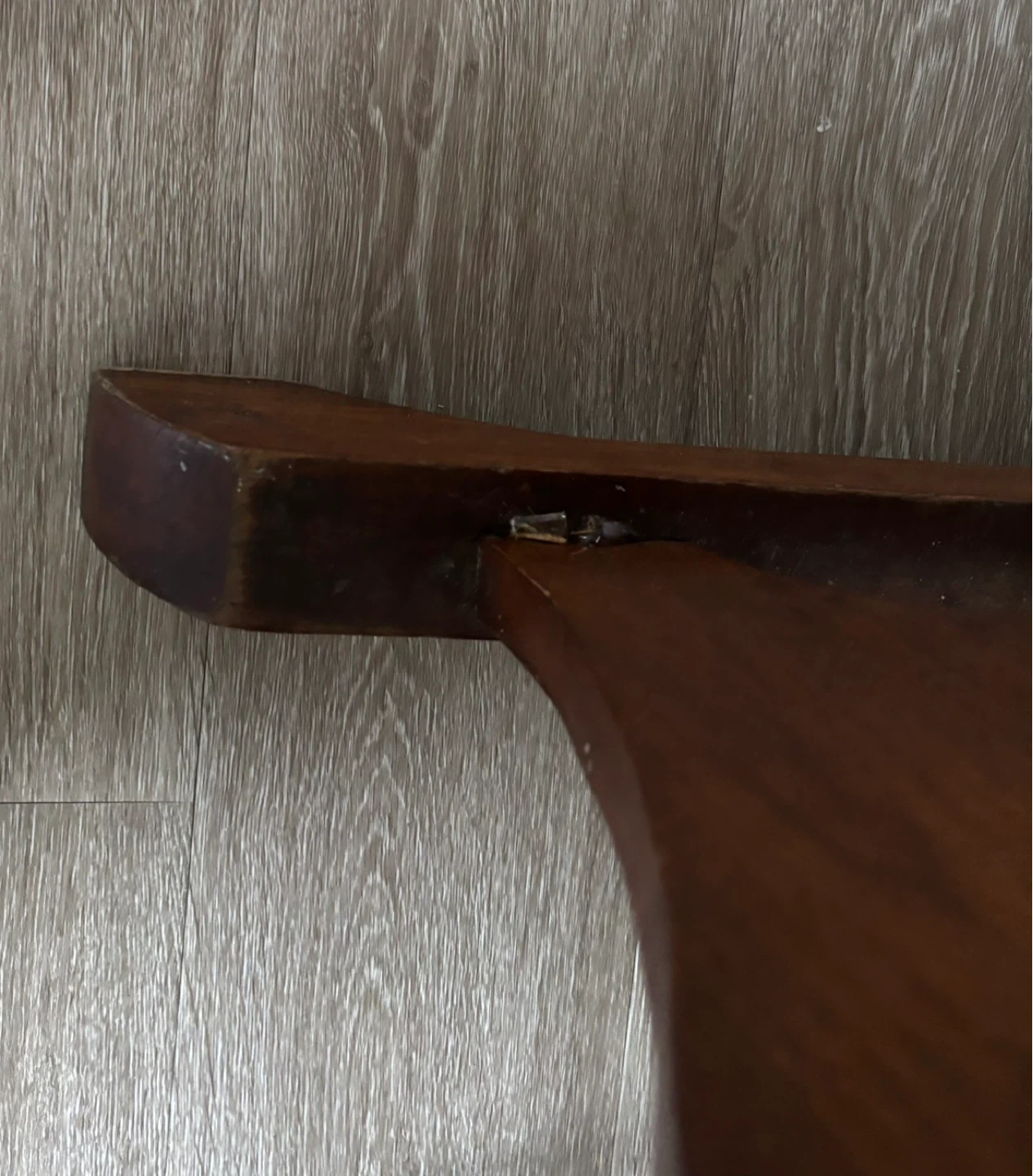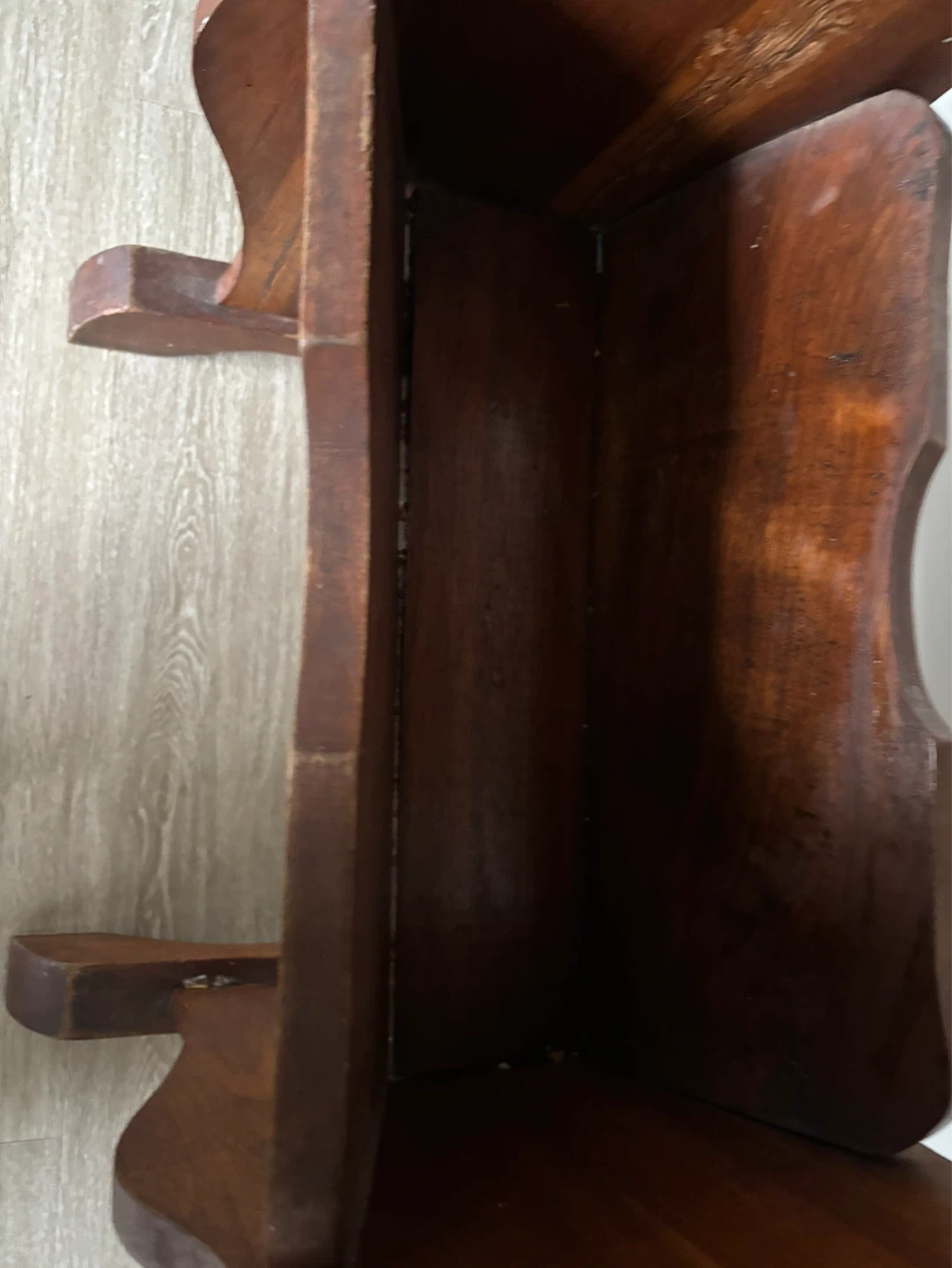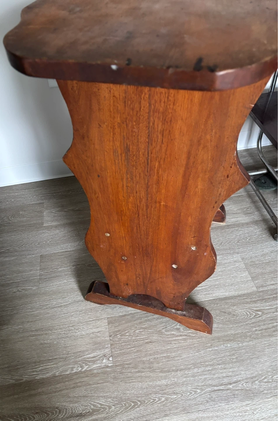 This is a vintage wooden accent table. It stands 34 inches tall and is 32 inches at its widest. It features a carved design on the sides and a convenient magazine rack below the tabletop. The wood has a warm, aged patina. The price reflects the pics.