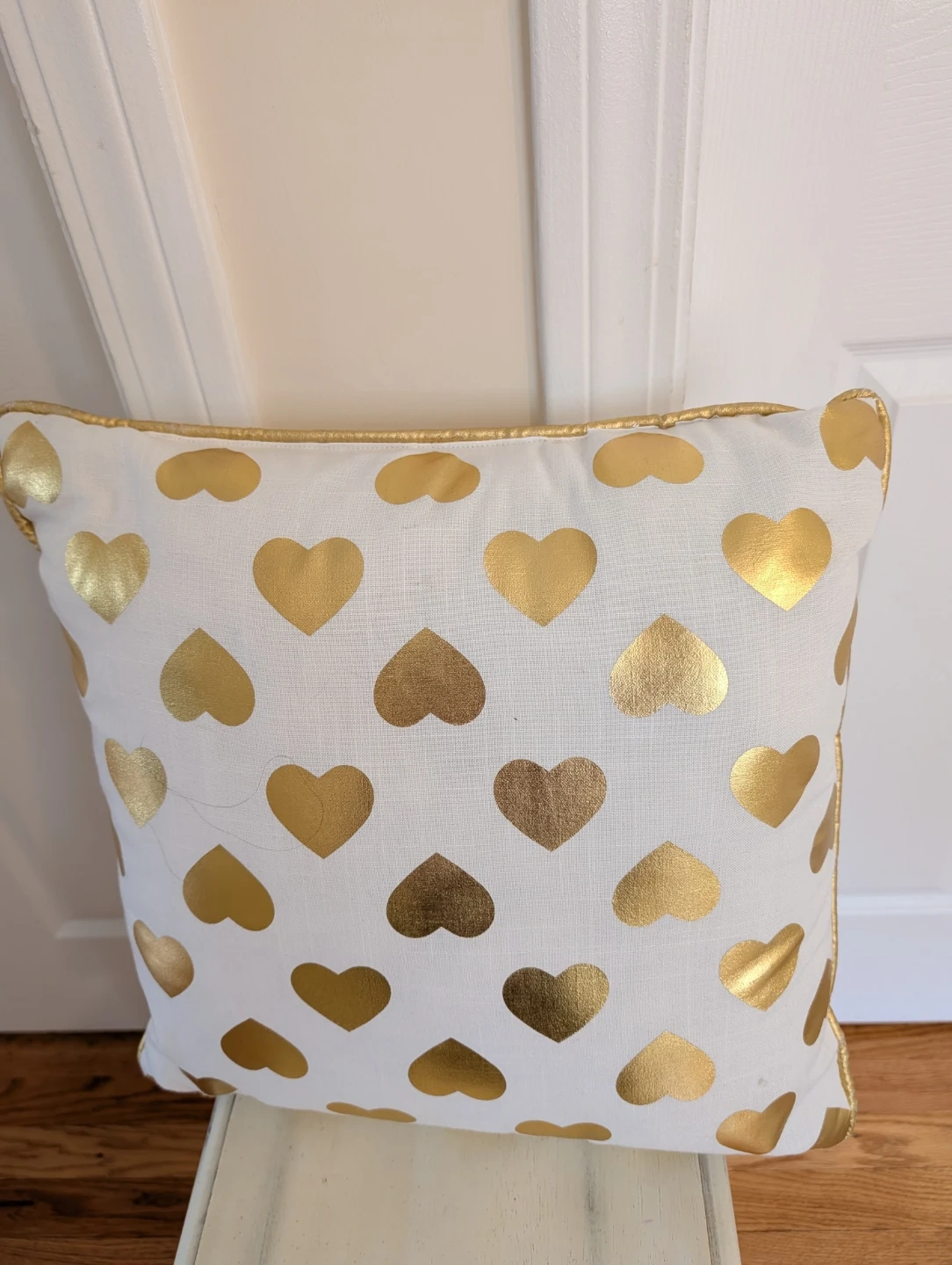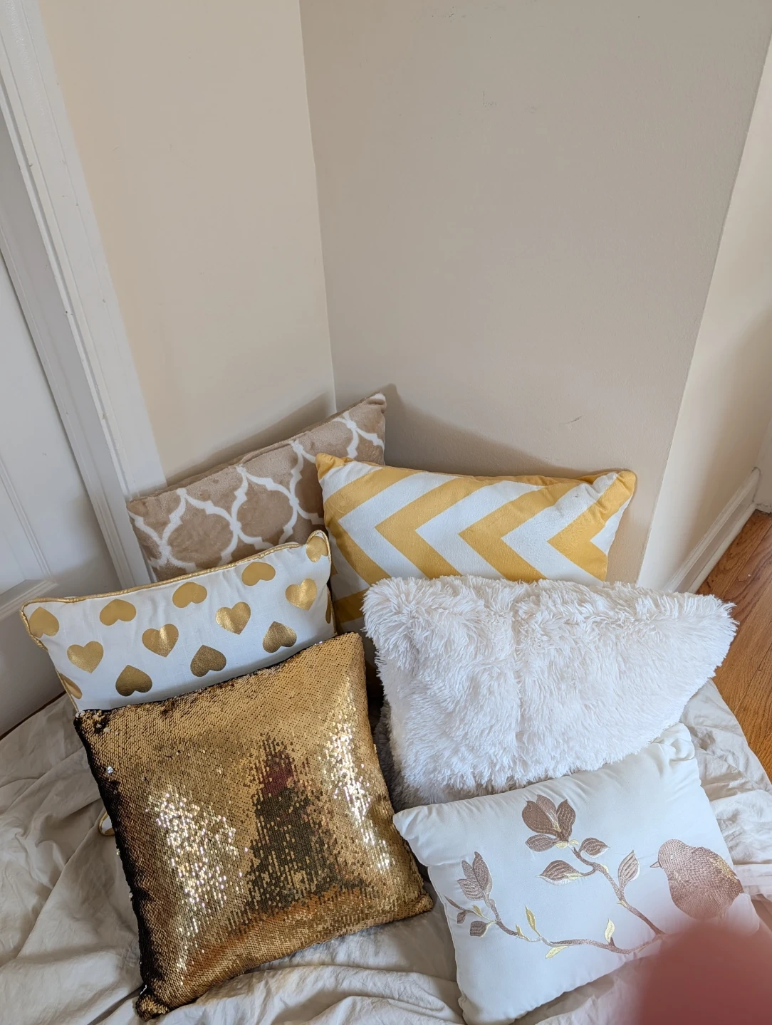 Add a touch of style to your home with this set of six decorative throw pillows. It includes a beige quatrefoil pillow, a yellow chevron pillow, a white pillow with gold hearts, a gold sequin pillow, and a white pillow with a gold floral bird design. They're perfect for adding comfort and flair to any couch or armchair!