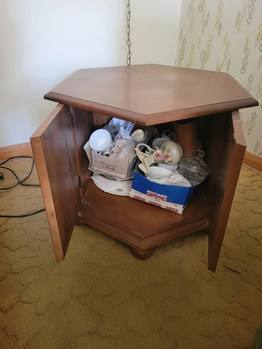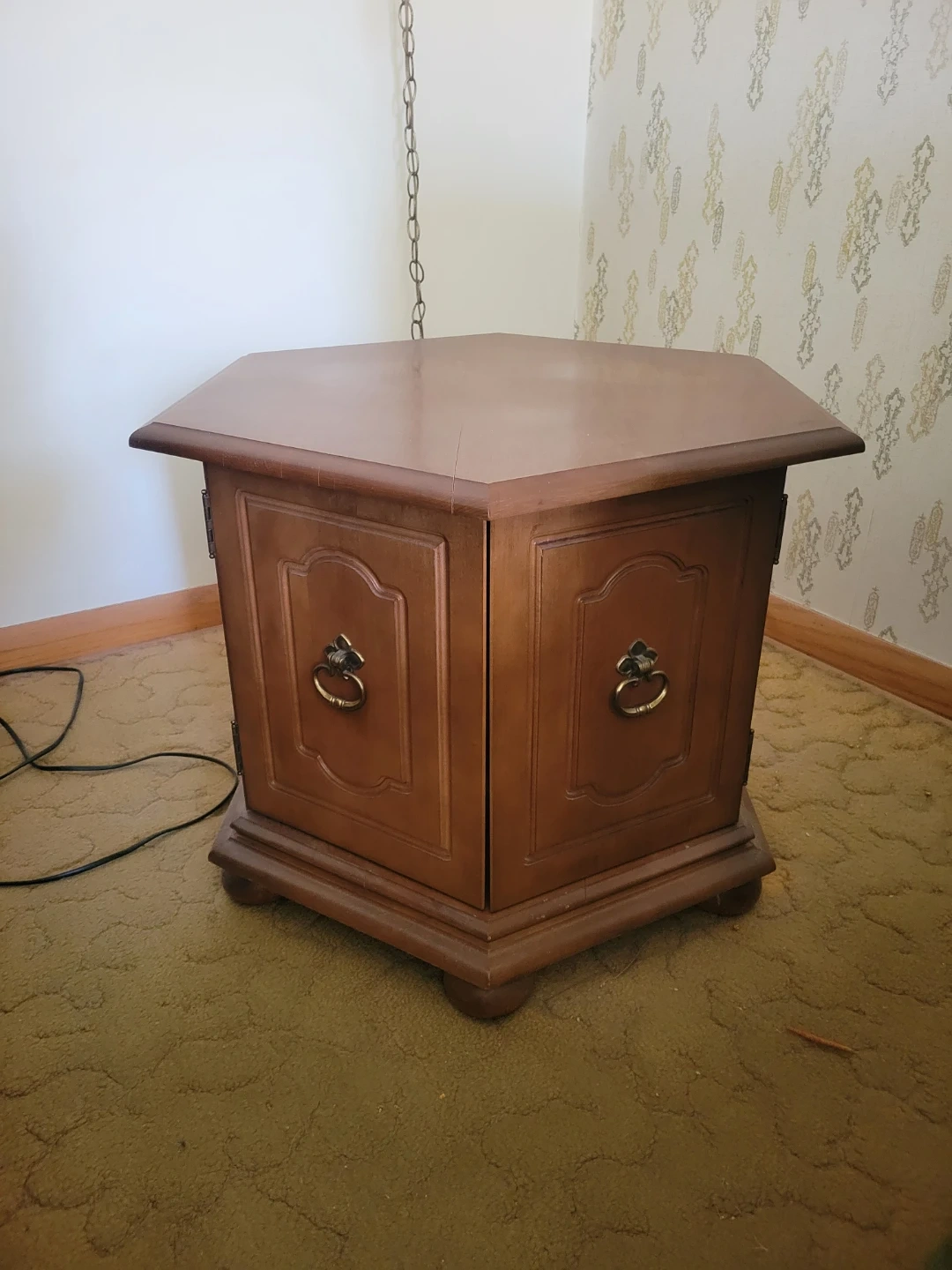This vintage end table offers convenient storage with its two cabinet doors. It's made of wood and has decorative drawer pulls. The top is a hexagon shape.