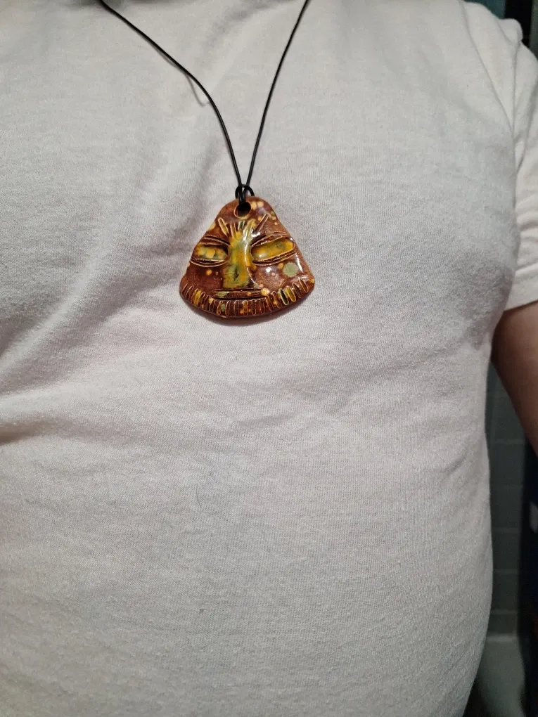Handmade ceramic pendant with a tribal face design. Features a brown and yellow glaze. Comes on a black cord.