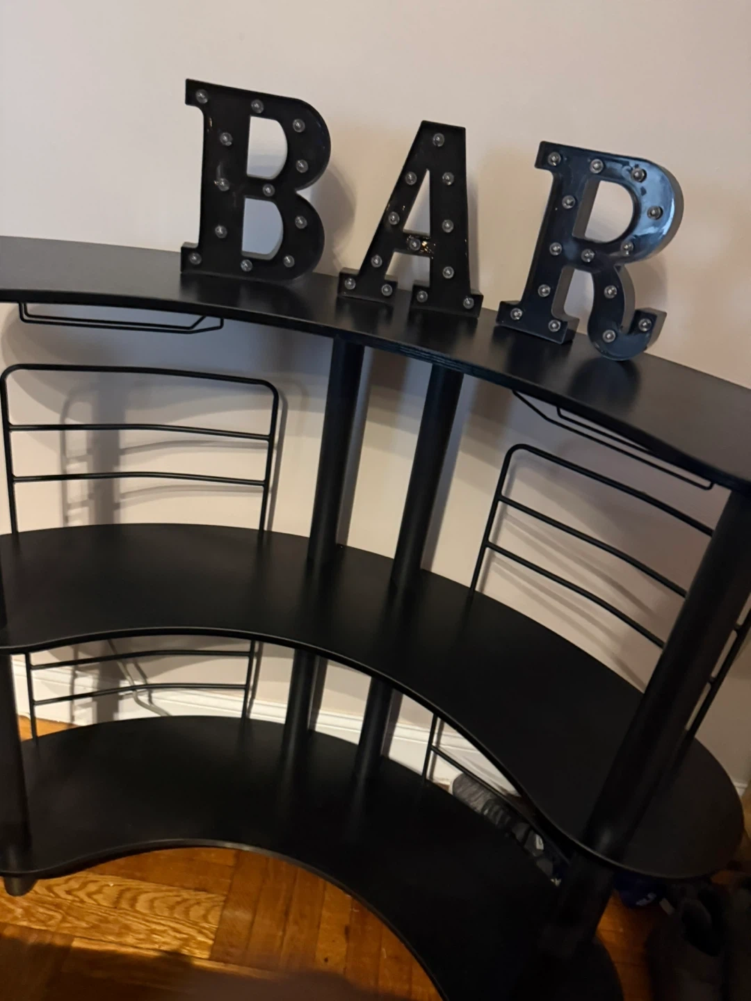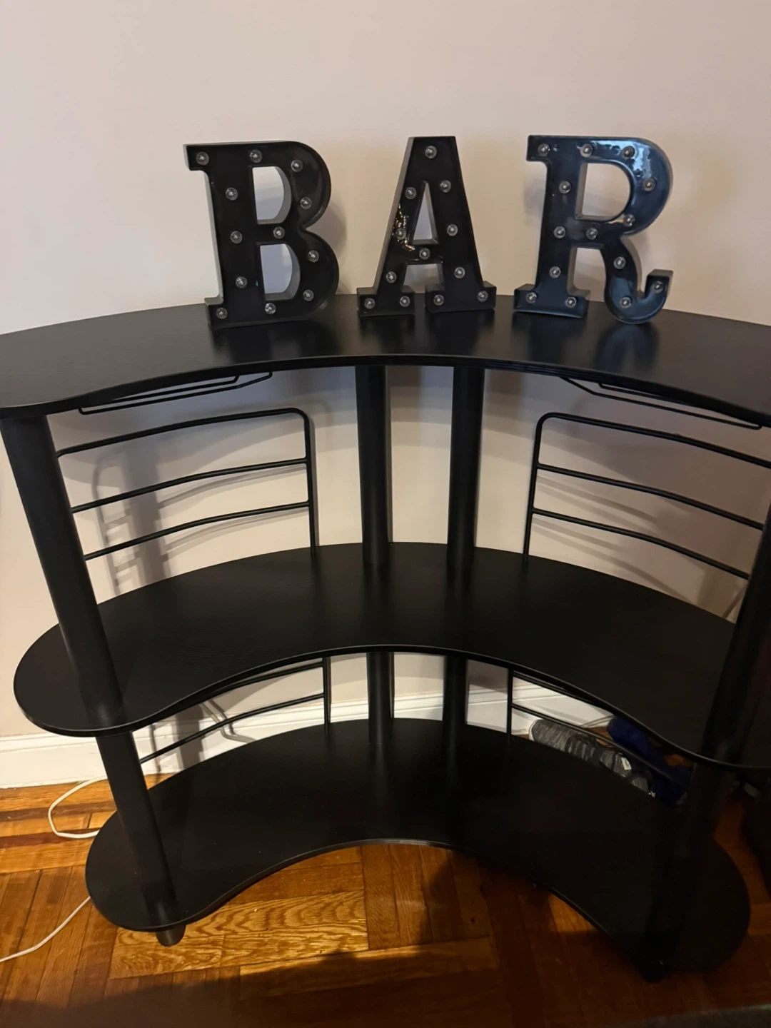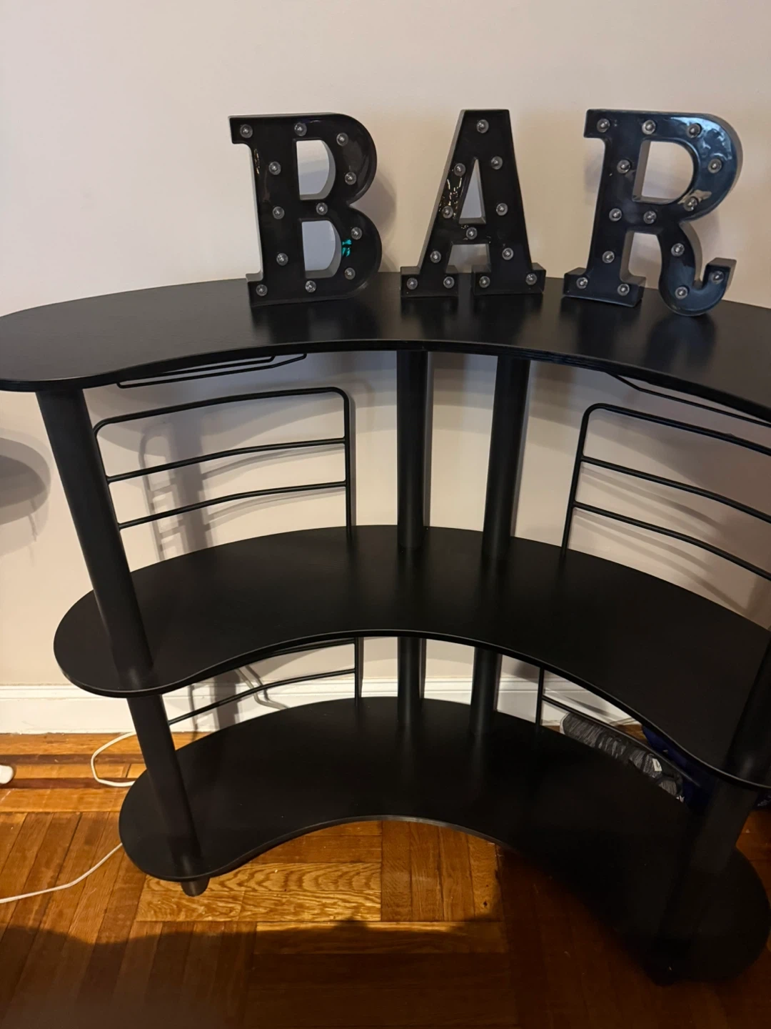 Selling a black bar table. It has a sleek design with multiple shelves for storage. Great for entertaining or adding a stylish touch to your home